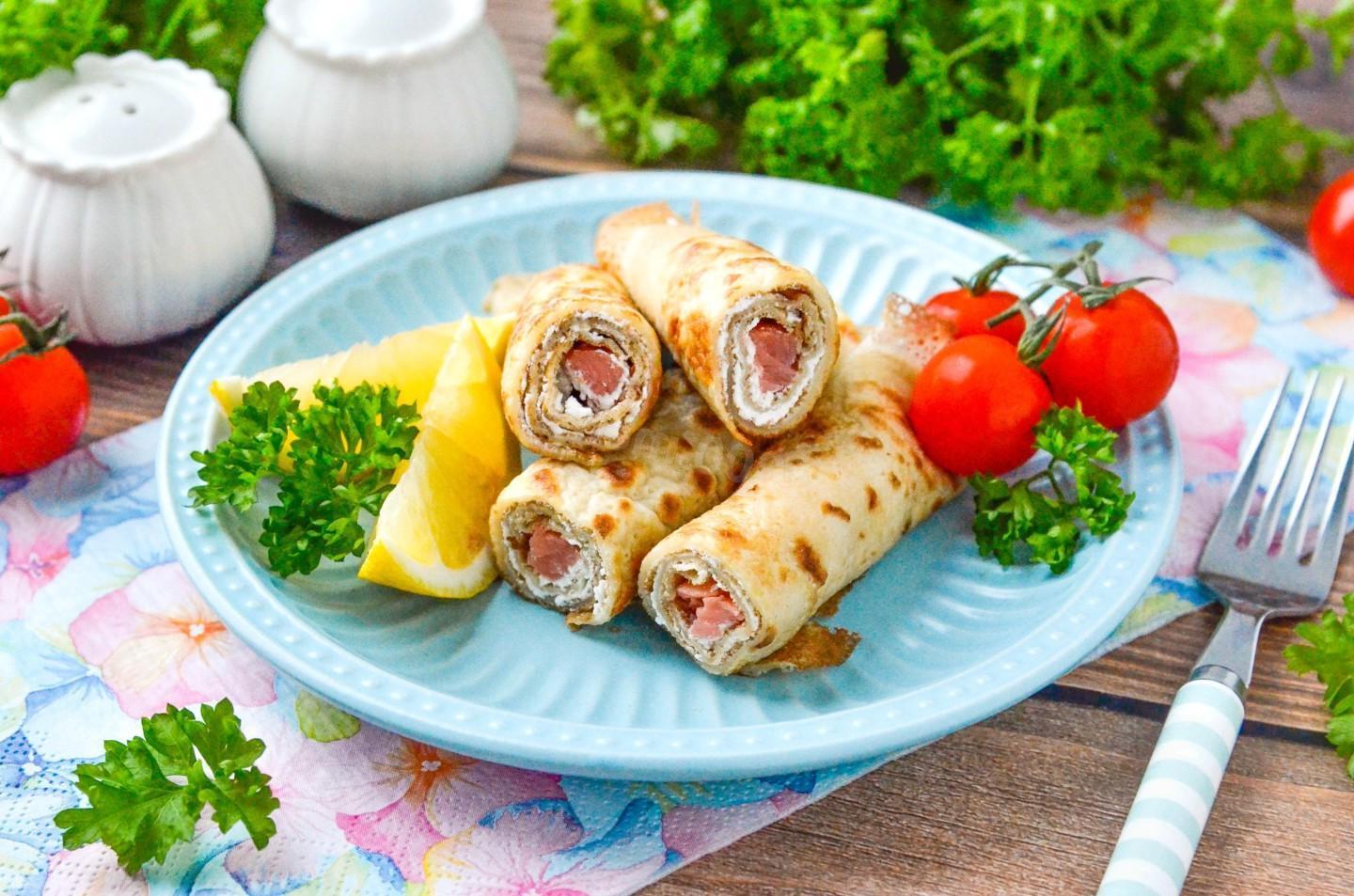 An excellent dish with exquisite taste — everyone will love it! Pancakes with red fish and curd cheese have already become classic with this combination of products. Any thin pancakes are suitable for stuffing; these are prepared in milk and boiling water. You can take any fish — salted, smoked, even caviar.