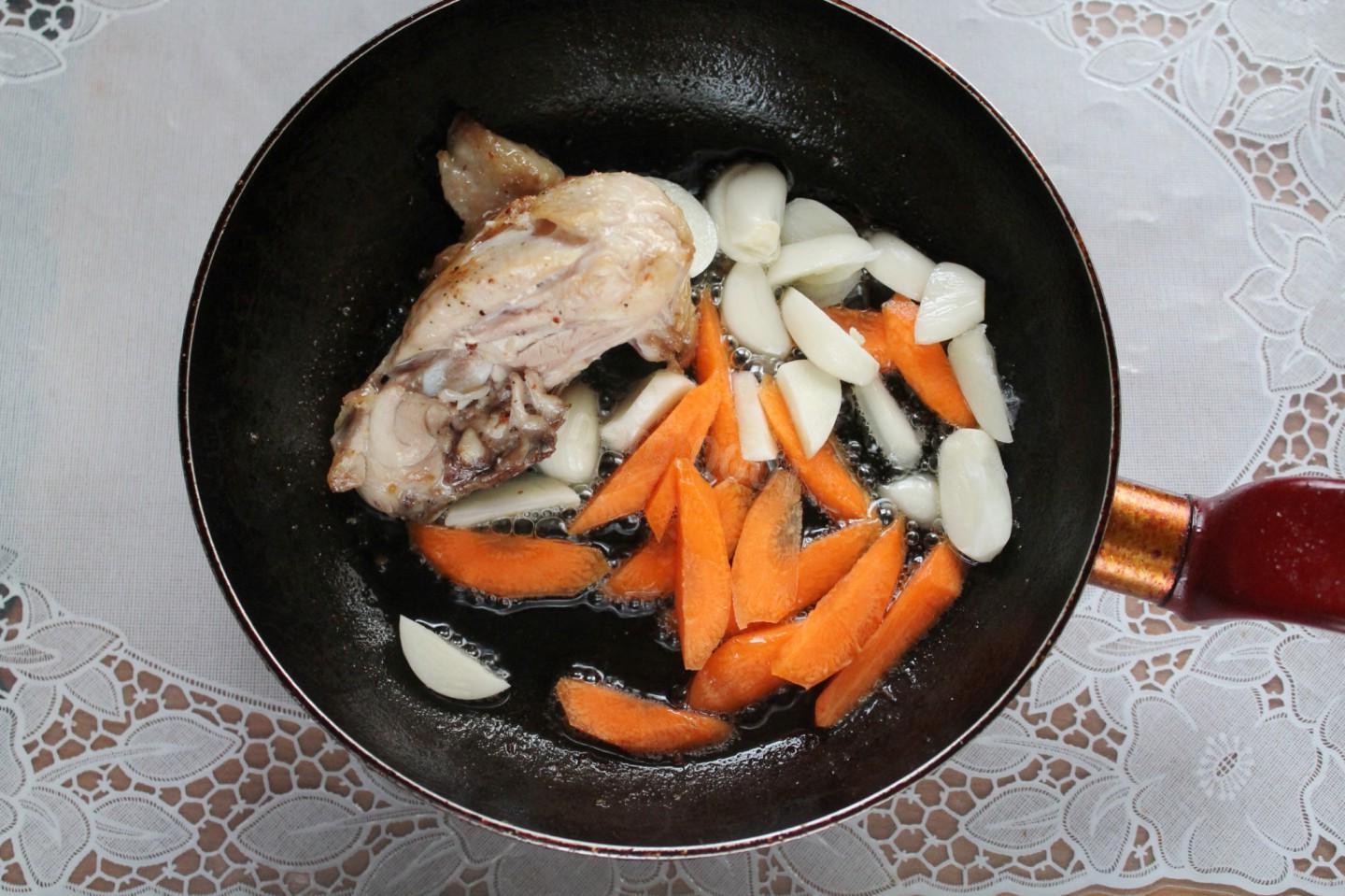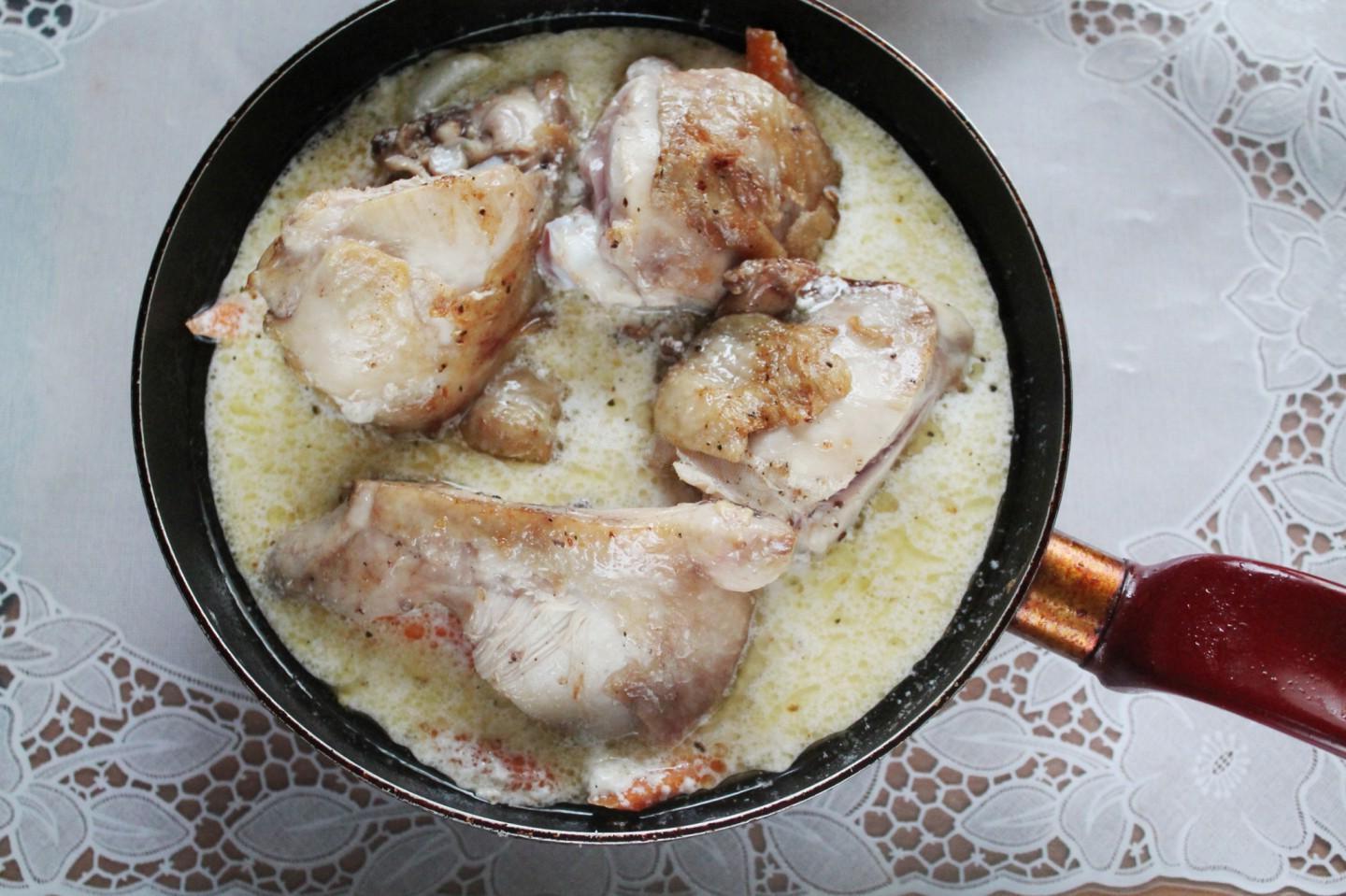 A complete dish for a family dinner with any side dish! Chicken pieces with garlic and carrots stewed in sour cream can be made for meeting friends or for a family celebration. The chicken meat turns out to be very soft and aromatic; both children and adults love this chicken.