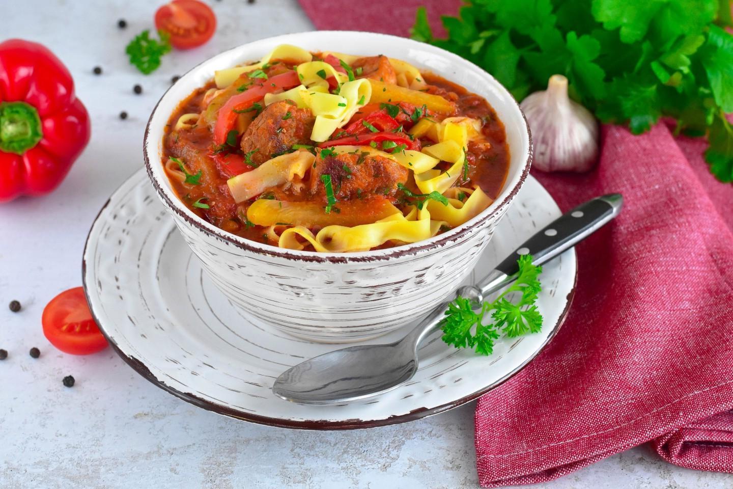Rich, appetizing, tasty and very satisfying. Classic pork lagman works better with homemade noodles, but it will also work well with quality store-bought noodles. The vegetable set can be supplemented at your choice, each time getting an almost new dish.