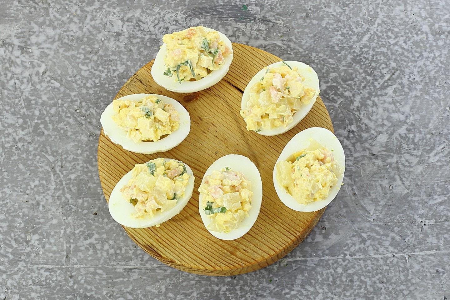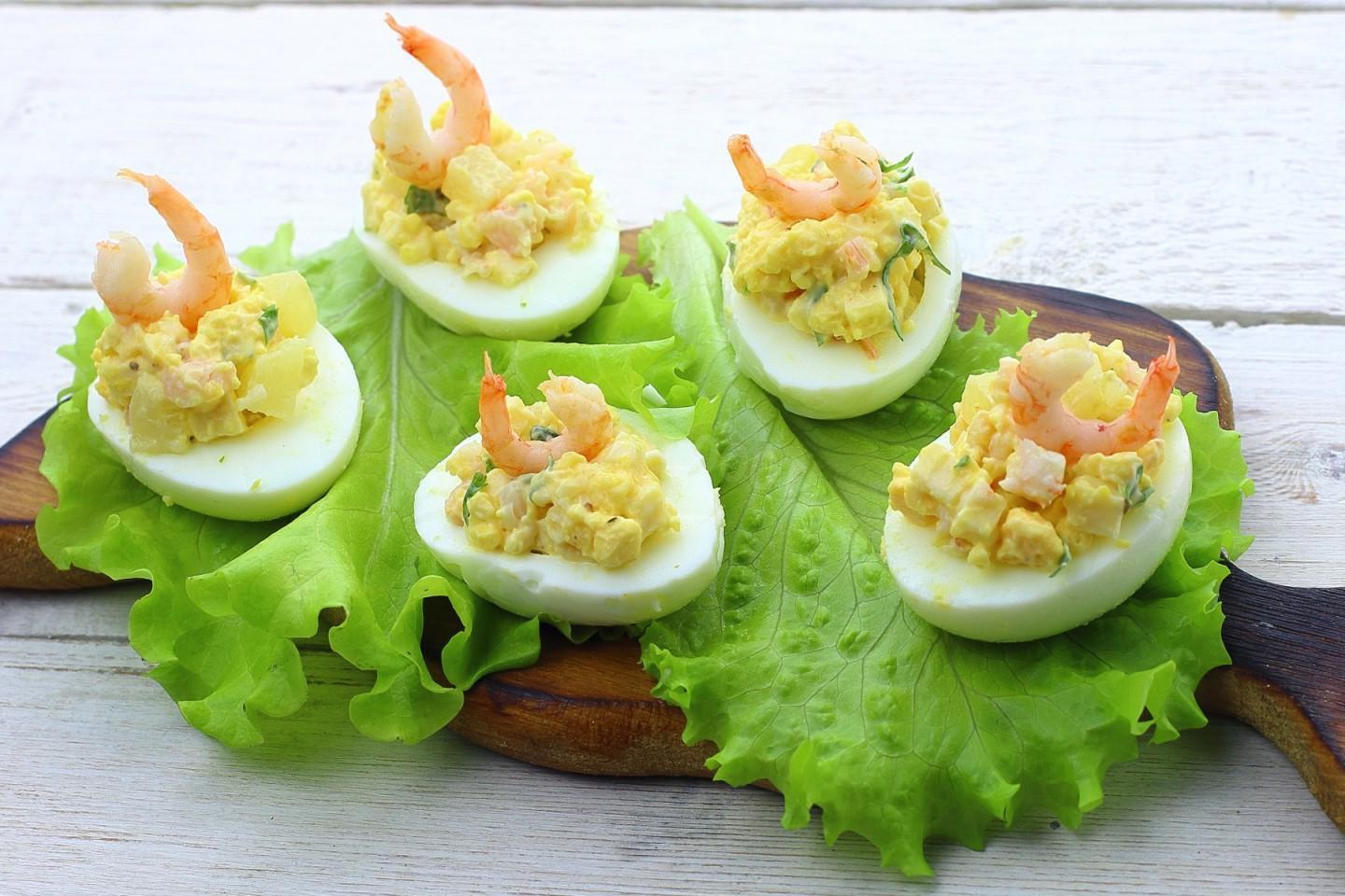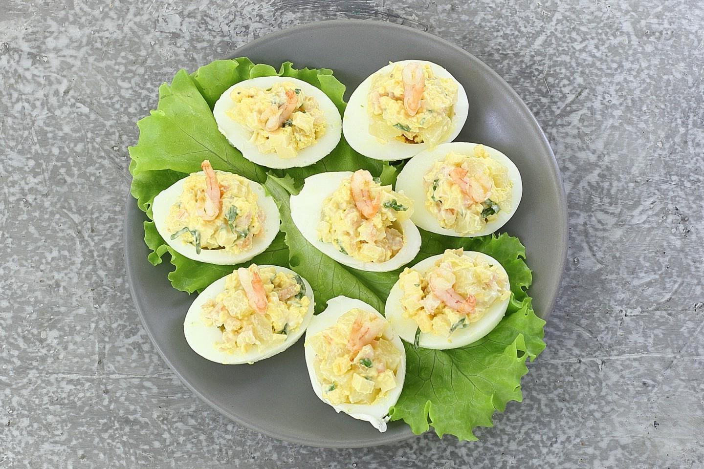 Snack in minutes from available products! Eggs stuffed with shrimp and pineapple are a delicious appetizer that can be prepared for a holiday or for every day. All ingredients in the filling harmonize well with each other. Serve the appetizer immediately after preparation.