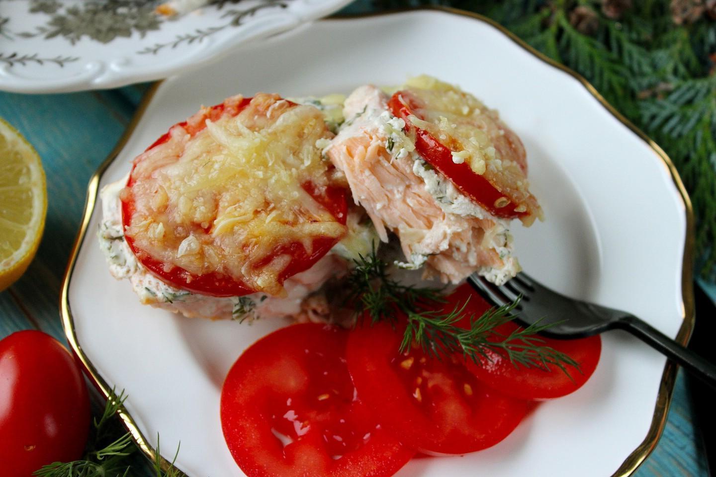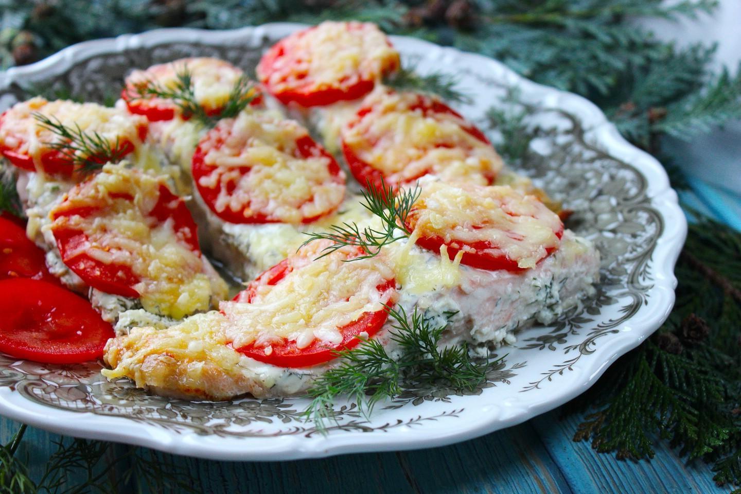 Juicy, aromatic, filling and incredibly delicious! Red fish in sour cream in the oven with tomatoes and cheese is an excellent option for a delicious dish for the holiday table. The fish literally melts in your mouth, with a pleasant sourness, in an unusual sour cream sauce.