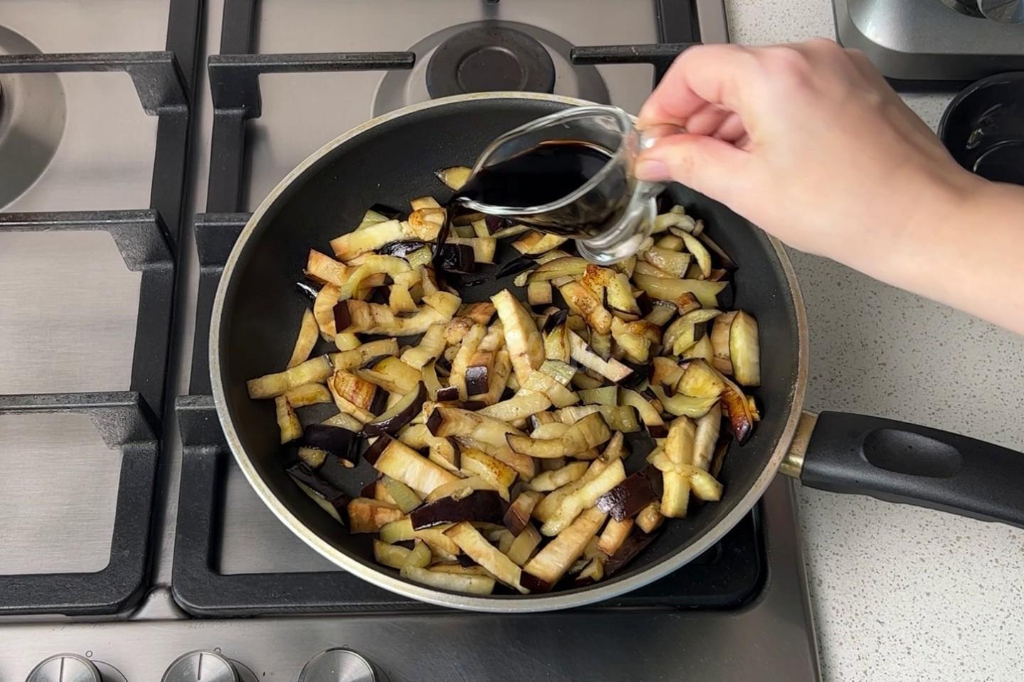 Amazingly delicious snack — youʼll lick your fingers! Caramelized eggplants are cooked with sugar and balsamic vinegar, which gives them a beautiful dark color. They taste hot, spicy, piquant, very tasty and original!