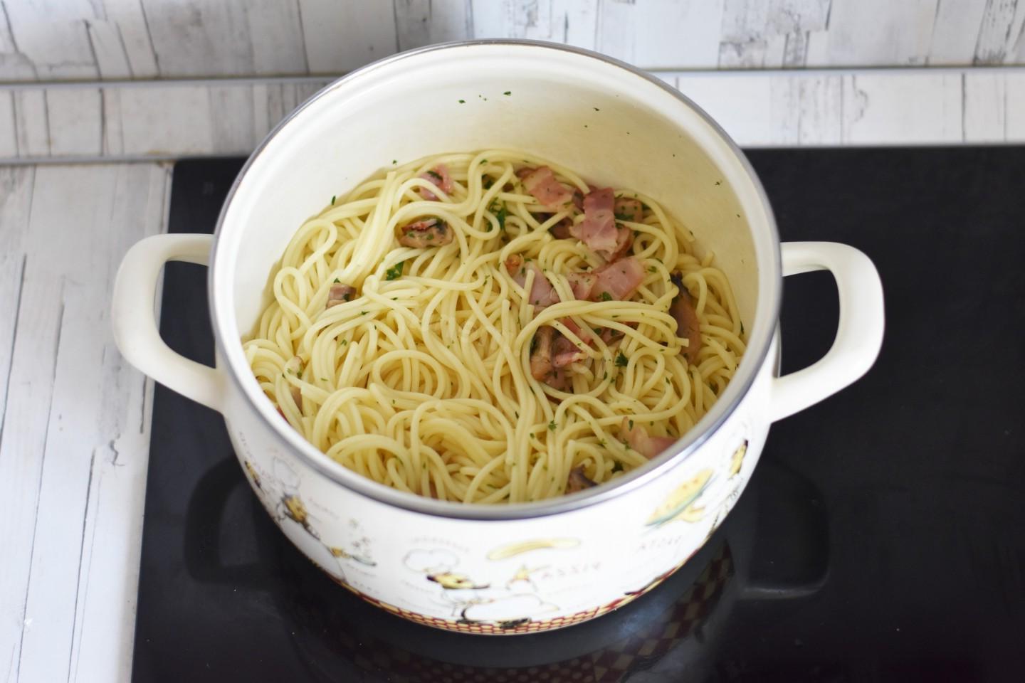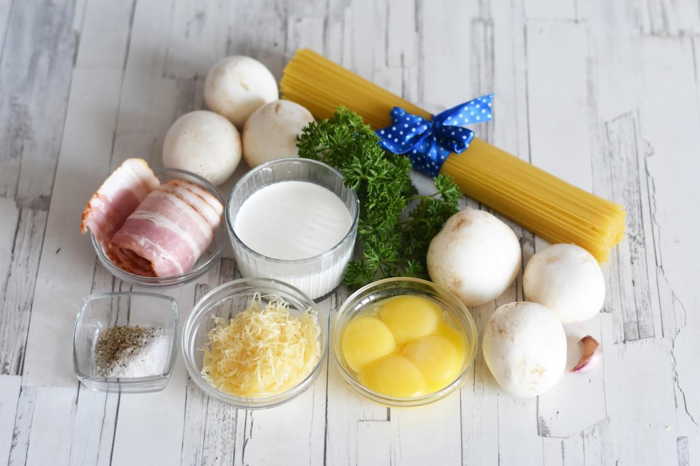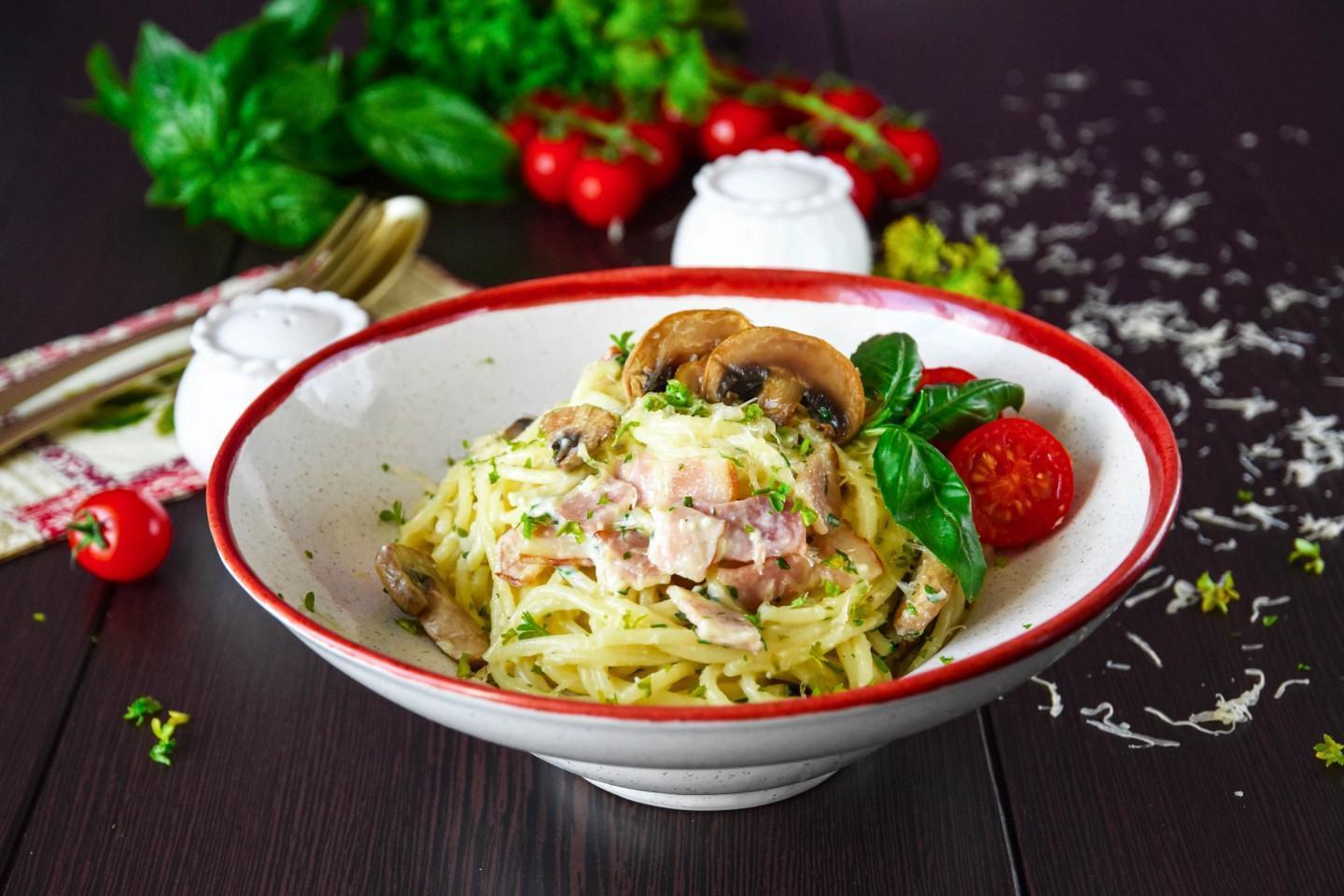 It is simply created for a romantic dinner with a glass of wine! Pasta carbonara with mushrooms, bacon and cream is not only delicious, but also quite simple. The most important thing is not to overcook the spaghetti, and even a novice housewife can handle everything else!