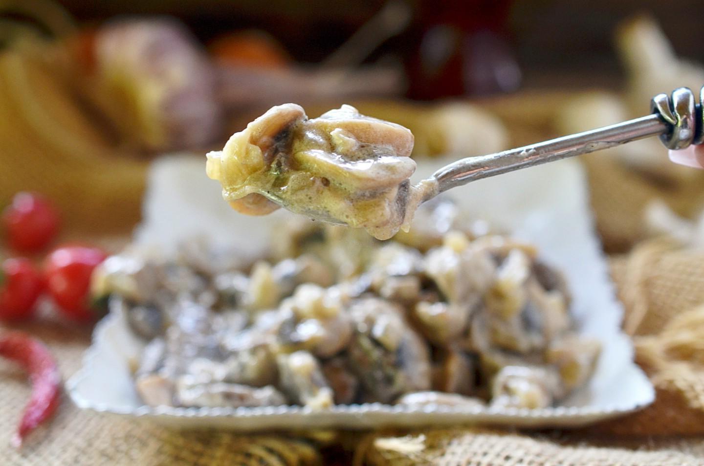 Fast, simple, and delicious! Stewed mushrooms in sour cream sauce. Champignons in sour cream with garlic in a frying pan are delicious both hot and cold. The dish can be served as a main dish, and such mushrooms can also be used as a filling or component of salads.