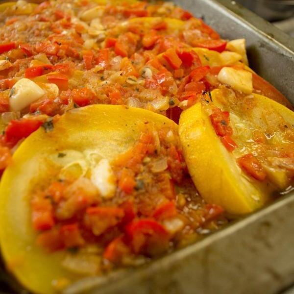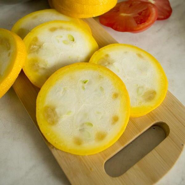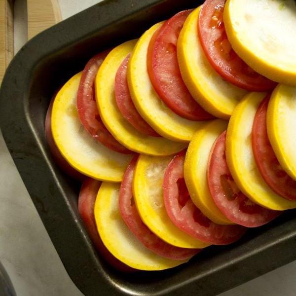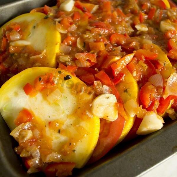 A beautiful light summer dish that is quick and easy to prepare. When it’s summer, and store shelves are full of colorful vegetables for every taste, it’s a real sin not to grab and cook. First I saw a huge yellow zucchini nestling like a python in a box, and I took it right away. Then pink tomatoes, which I remember from childhood for their sweetness and sugary texture. Still red for company. I was scrolling through the recipes over the kitchen table, and I immediately discarded my favorite fried zucchini slices — it was a pity to cover it with breading and spoil the color by frying, and I didn’t want to mash it into the oven and raw — I also didn’t want to. I decided to keep it simple, highlighting the yellow with tomato red. It turned out very tasty, sour, spicy, aromatic and completely summery.