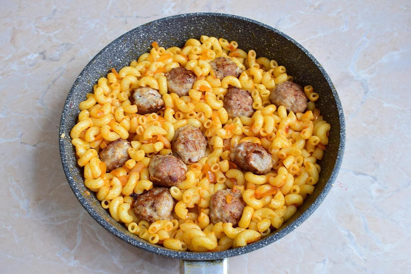 A simple and satisfying dish — especially loved by children! Pasta with meatballs in a frying pan diversifies the family menu. They can be served with different sauces and vegetable slices. They are prepared quickly and are suitable for dinner.