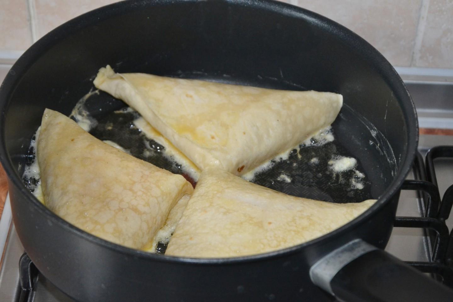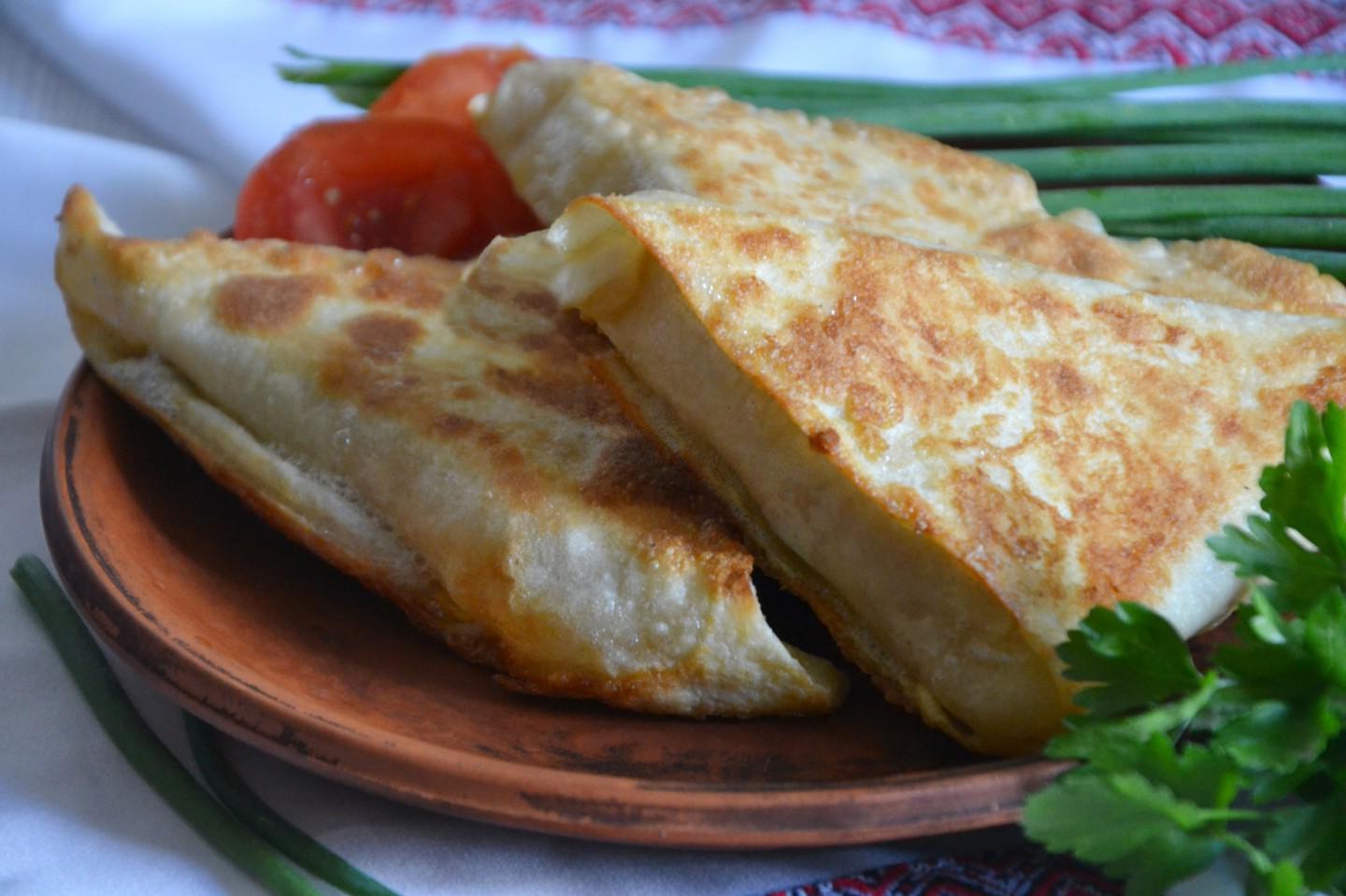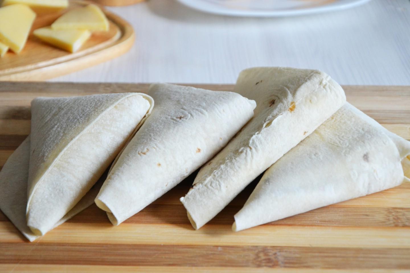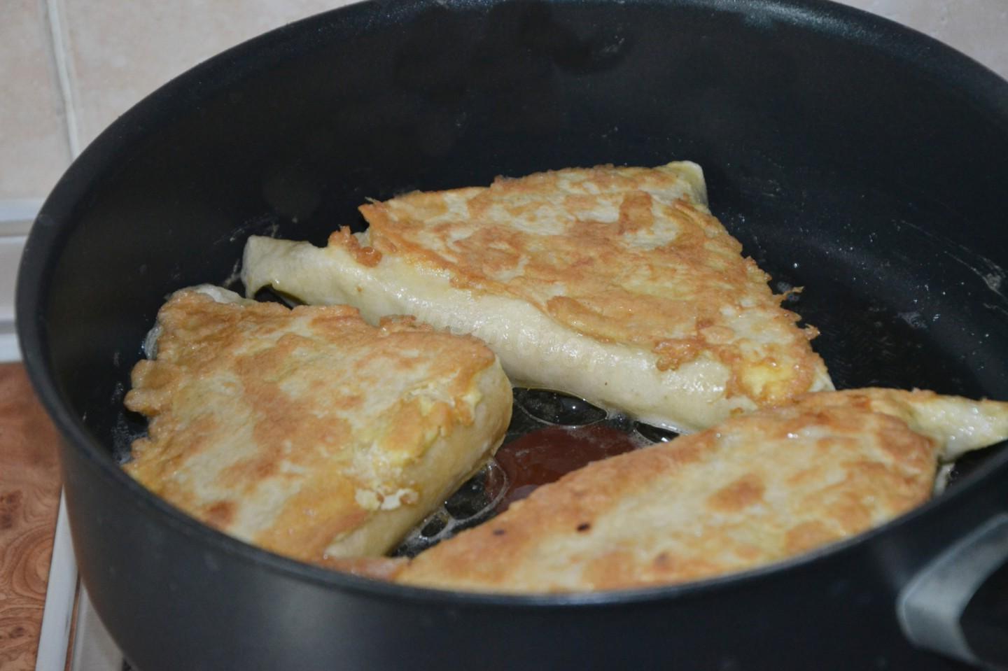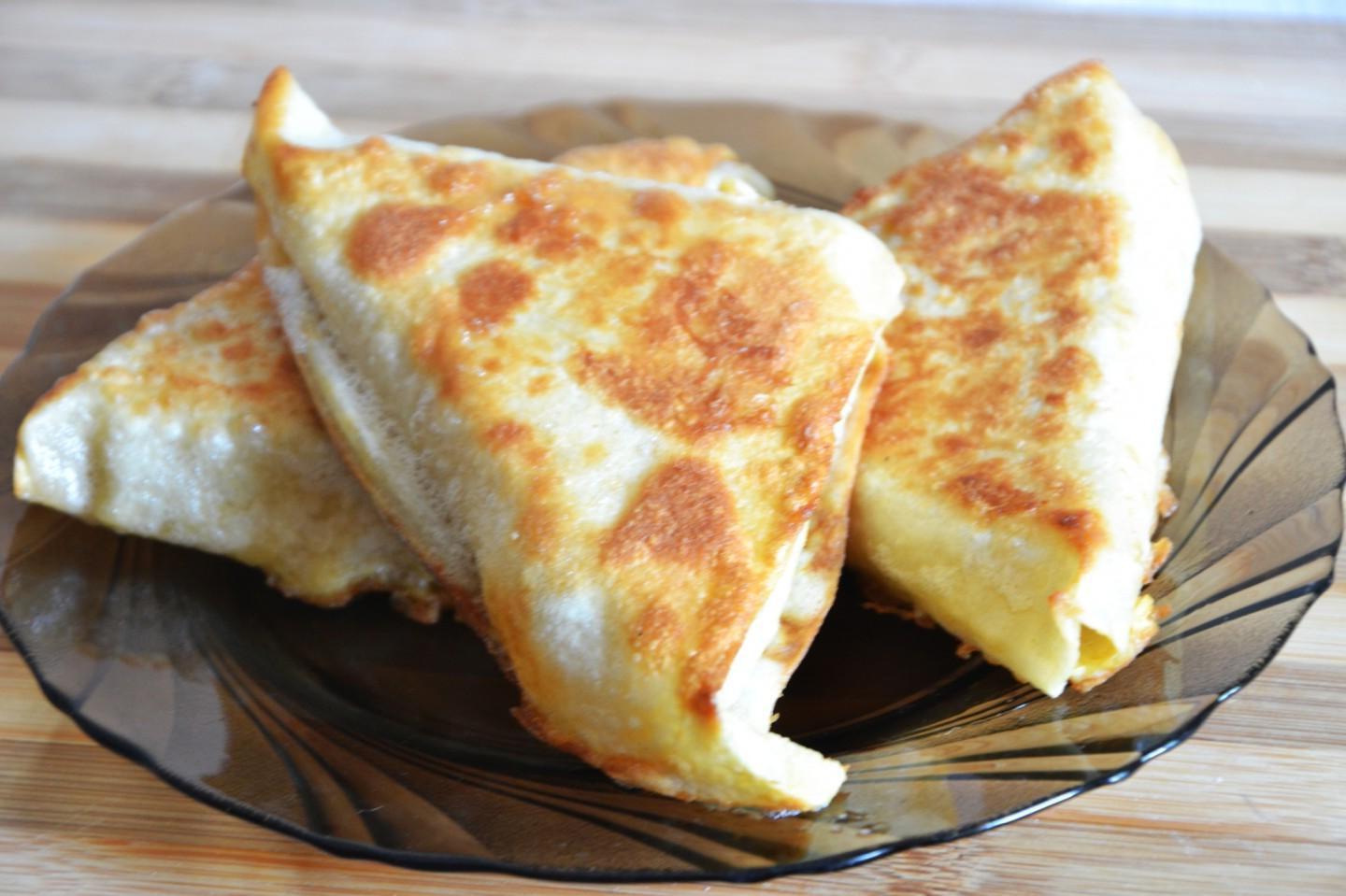 Delicious, simple, satisfying and quick for breakfast and on the go! I cook triangles of pita bread stuffed with cheese and sausage with any filling: whatever is in the refrigerator will work. But cheese is a must. Tomatoes optional. The whole family will be grateful to you for such a wonderful and satisfying start to the day!