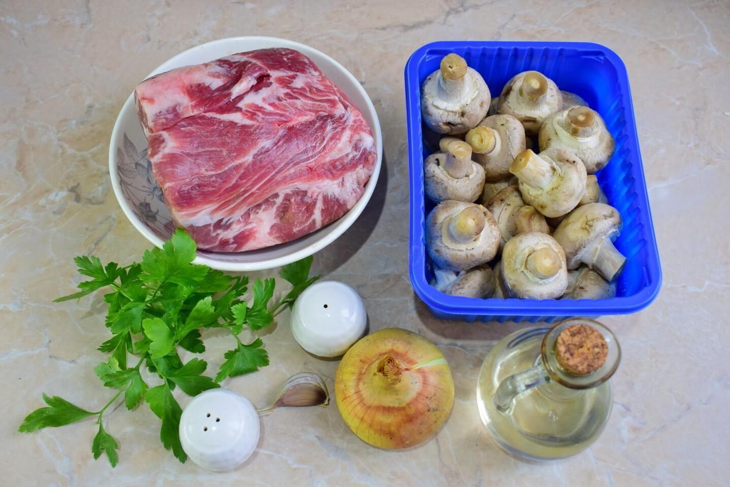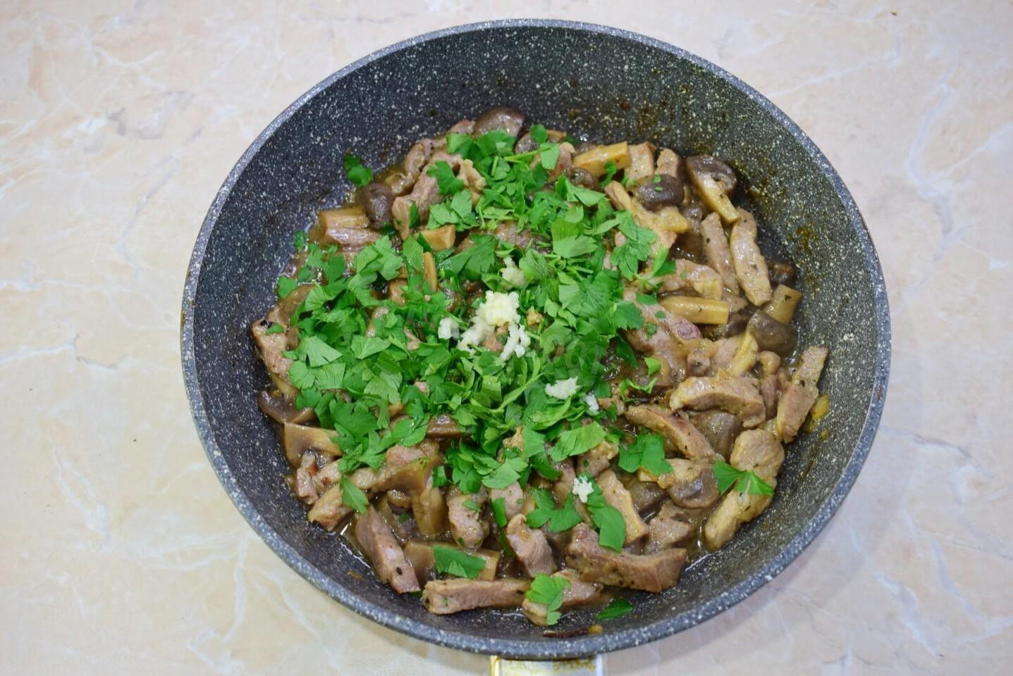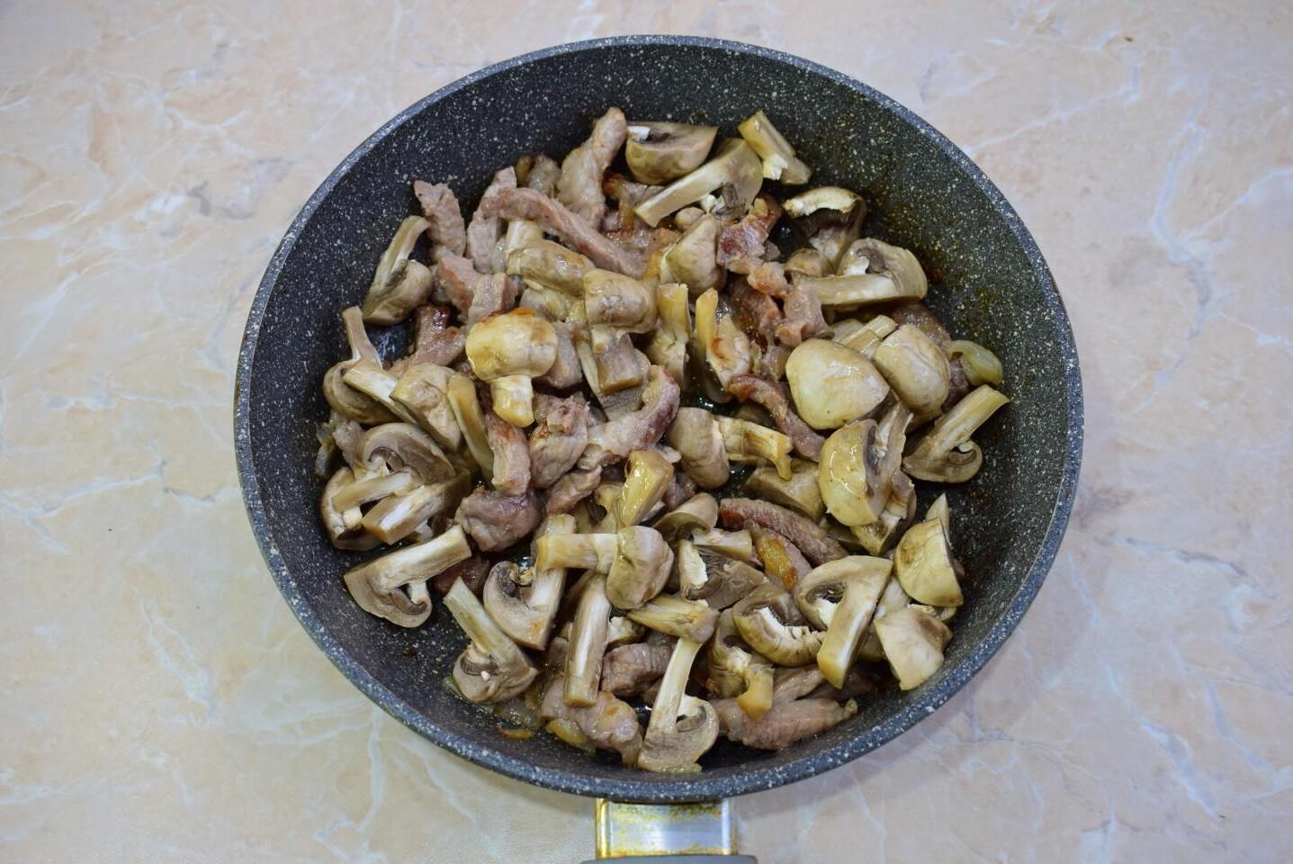 Tasty, satisfying and simple. Suitable for every day! Fried meat with mushrooms in a frying pan can be prepared as a hearty lunch or dinner. Delicious both as an independent dish and as an addition to any side dish.