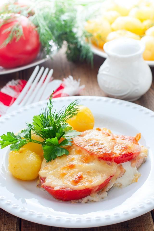 Tasty, simple, healthy, quick — for dinner or lunch. Pink salmon with tomatoes and cheese in the oven is prepared without any hassle, and the result is amazing. This dish can be varied with other vegetables or served with rice or potatoes. I love it as an independent dish. Try it too!