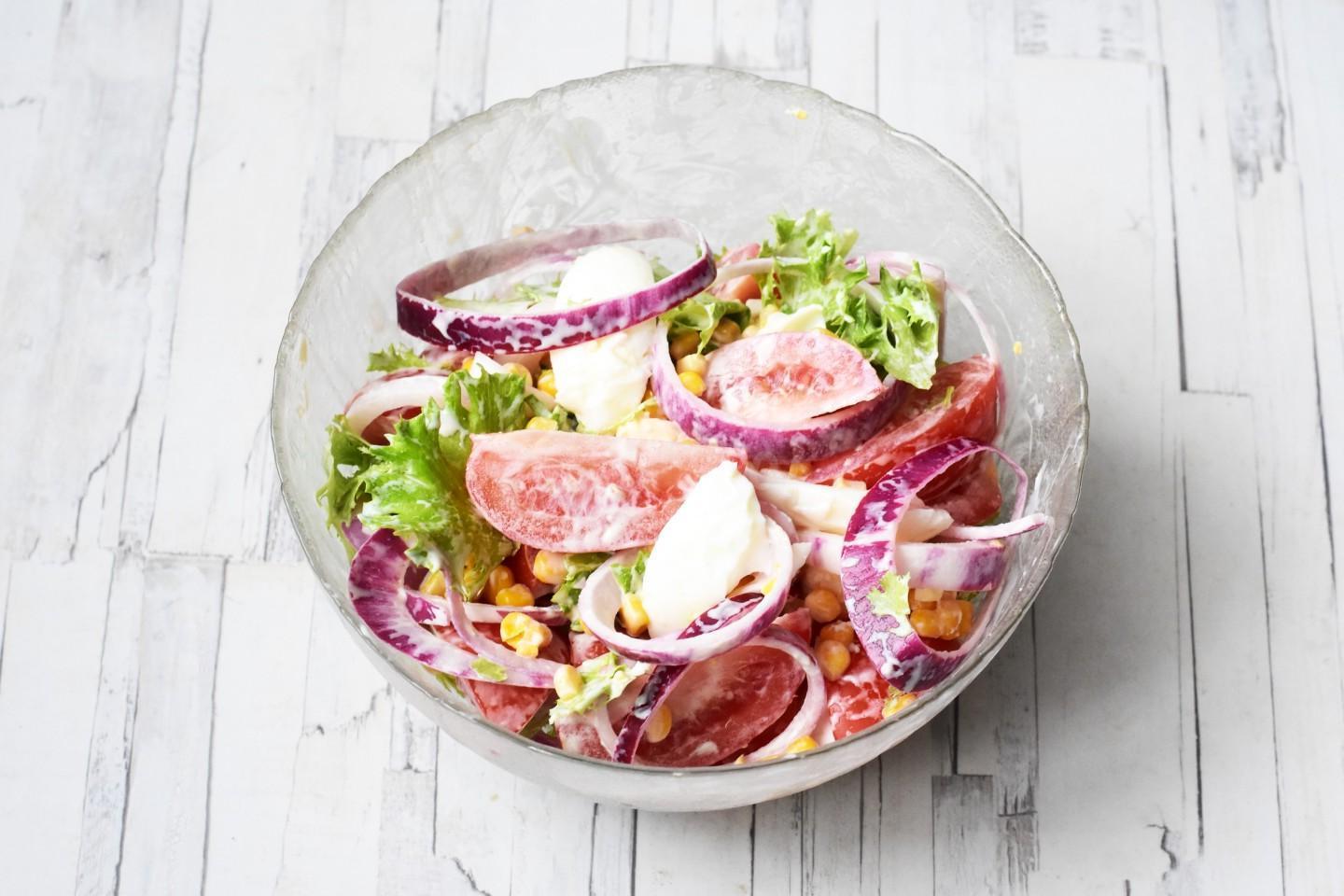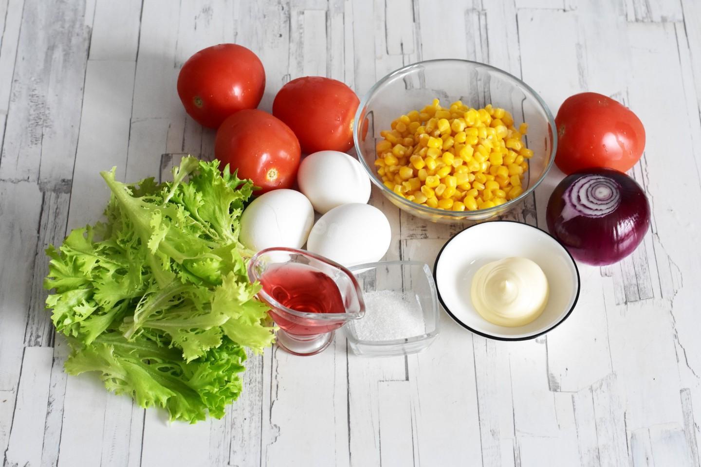 Bright, juicy, crispy, for any occasion. Salad with corn and tomatoes has a simple composition, but an unusual taste. Red onion marinated in vinegar gives the salad a pleasant spice. You can replace the mayonnaise dressing with olive oil — it will be no less tasty.