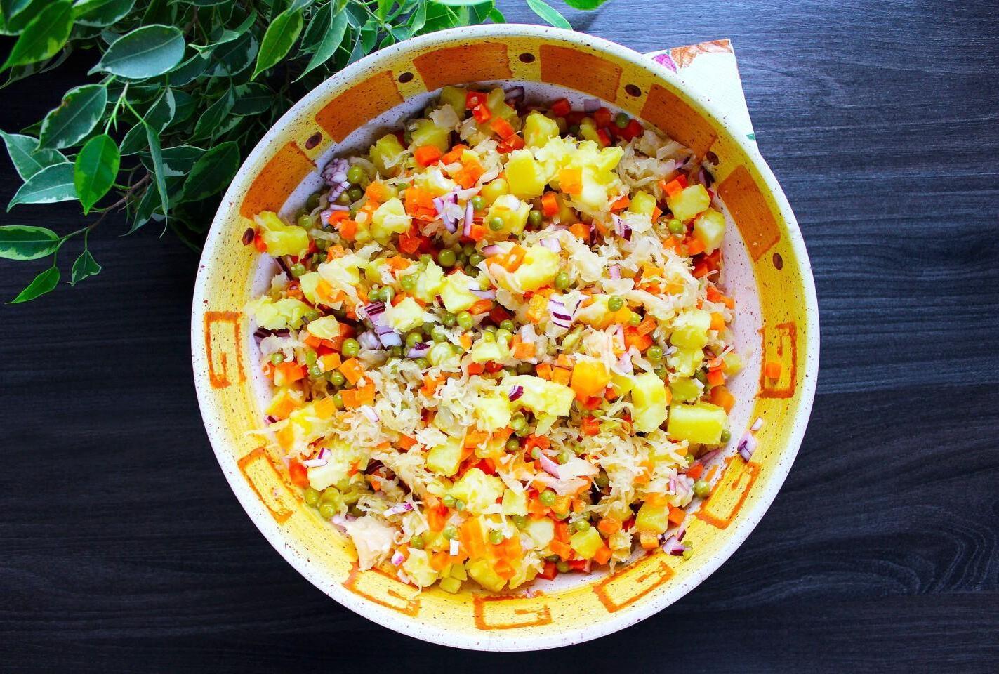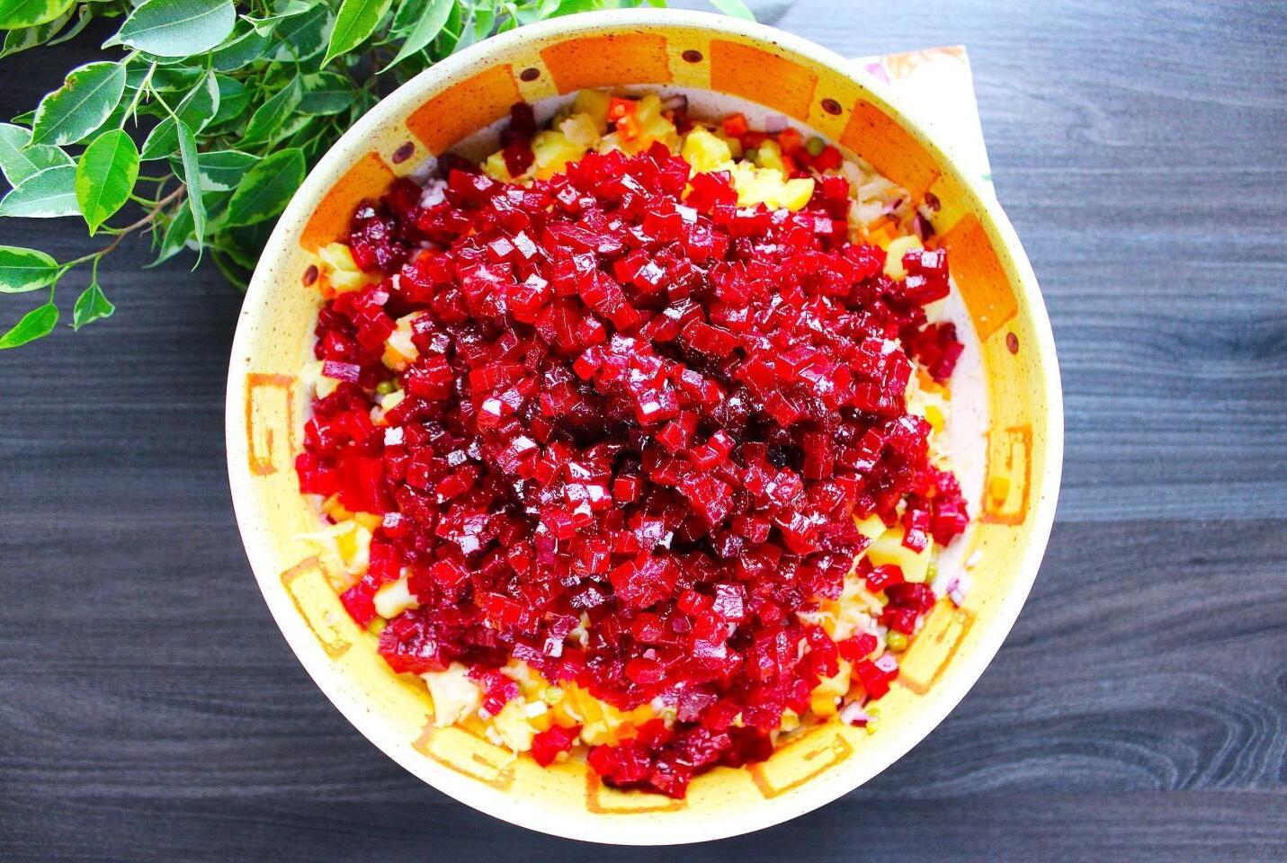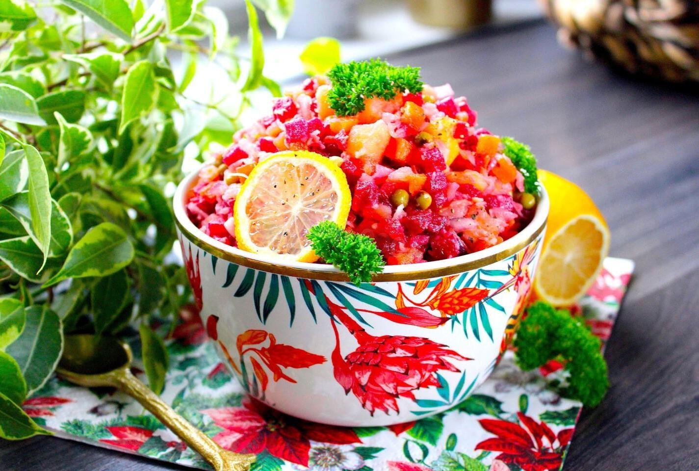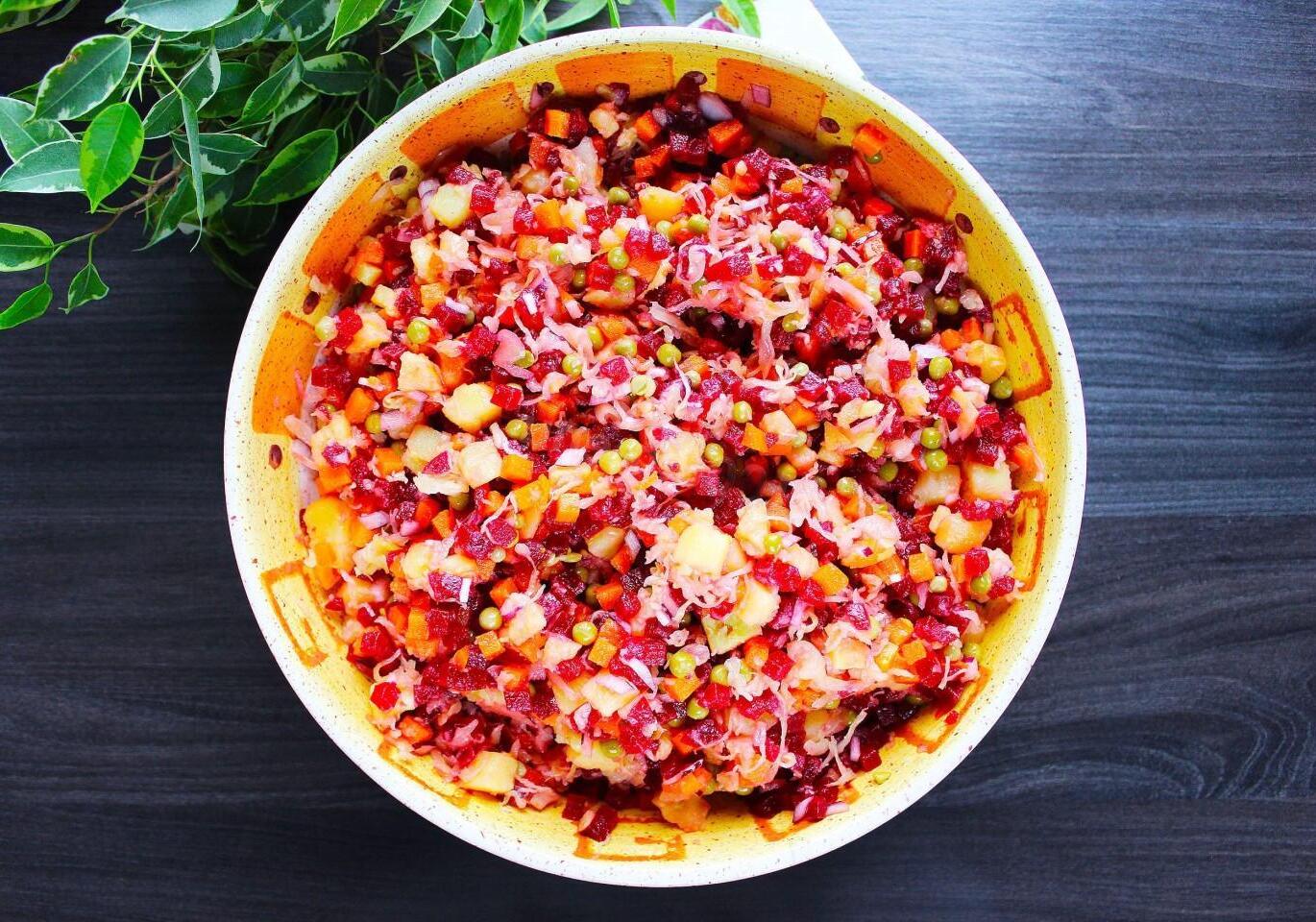 Light, vitamin-rich, very healthy, very bright and tasty! Vinaigrette without cucumbers is not much different from the classic one — its taste is almost the same, but the structure is more delicate. Especially if you take thinly shredded sauerkraut. But you can also add cucumbers, salted or pickled, of your choice.