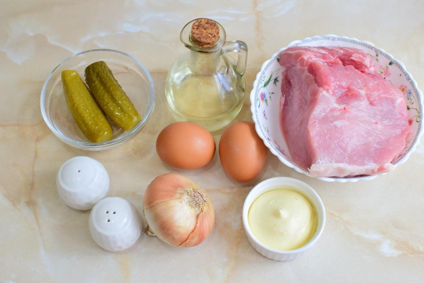 A very good combination of ingredients! Impossible to tear yourself away! Salad with meat and pickles can be prepared for any feast. It turns out very satisfying and will perfectly complement any side dish. Instead of mayonnaise, you can use sour cream.
