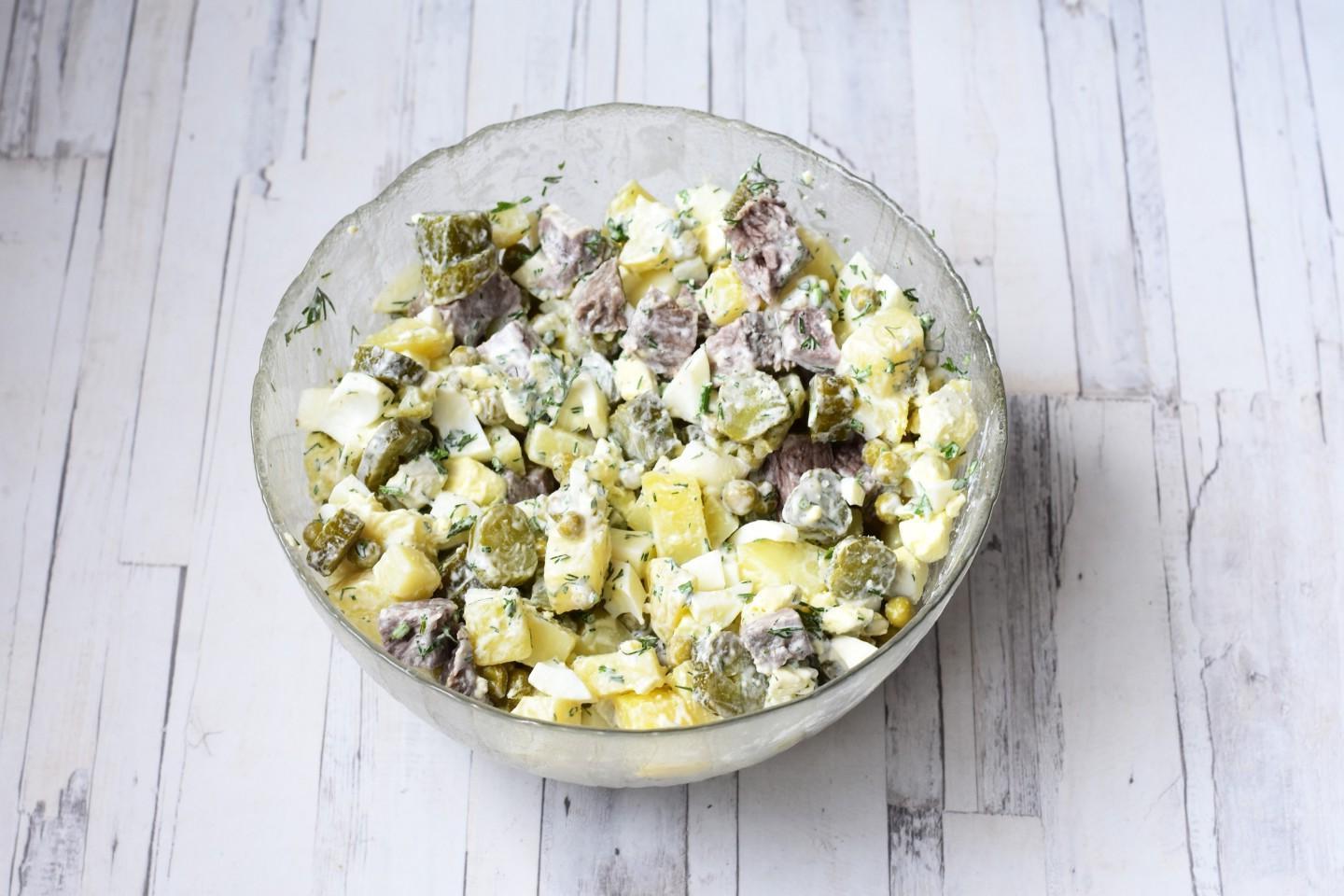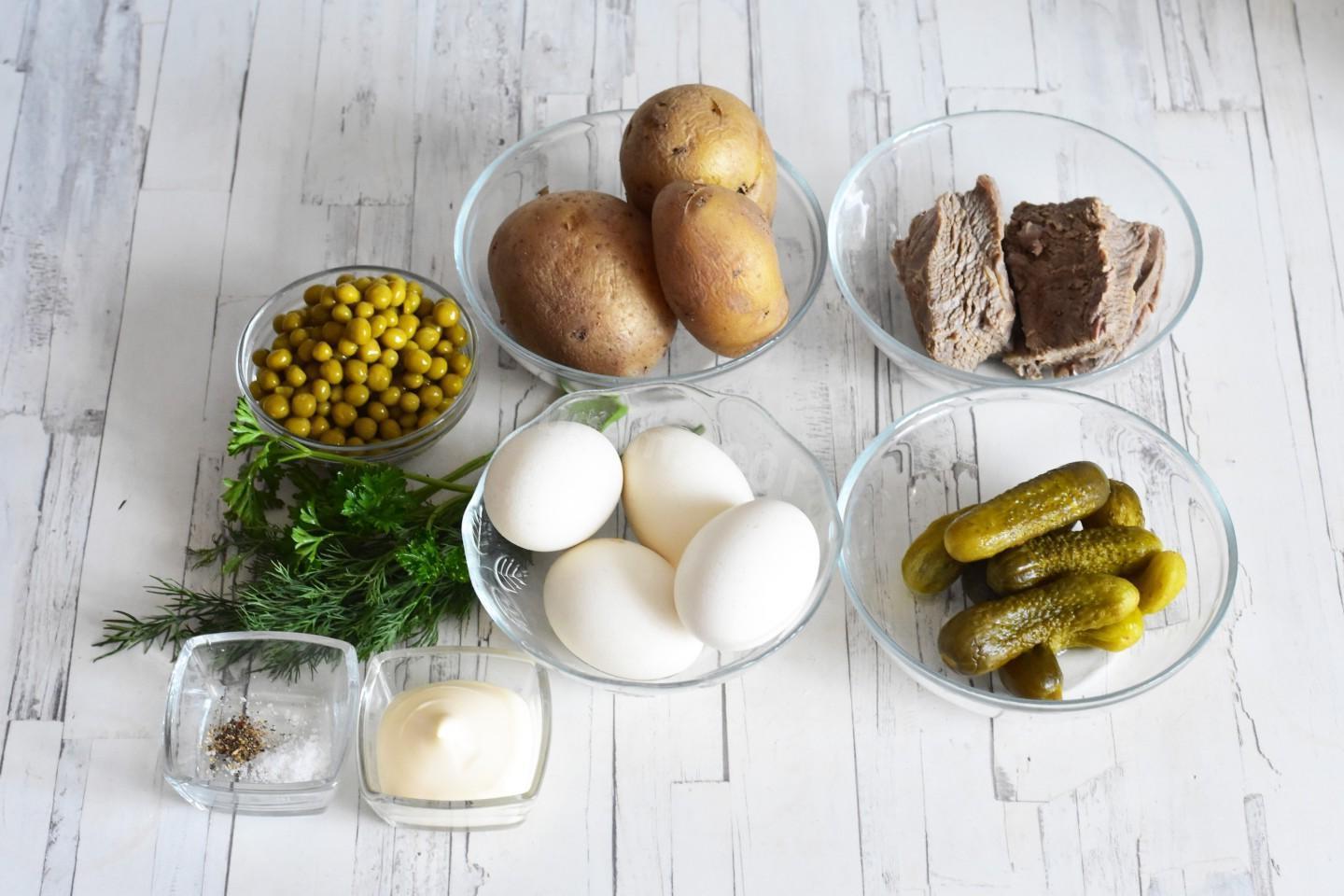 Very satisfying, suitable for both everyday life and holidays! Salad with beef and pickled cucumber is somewhat reminiscent of our Soviet Olivier in composition and taste. Potatoes, peas, pickles, eggs... only instead of boiled sausage there is tender boiled beef. The salad turns out simply amazing!