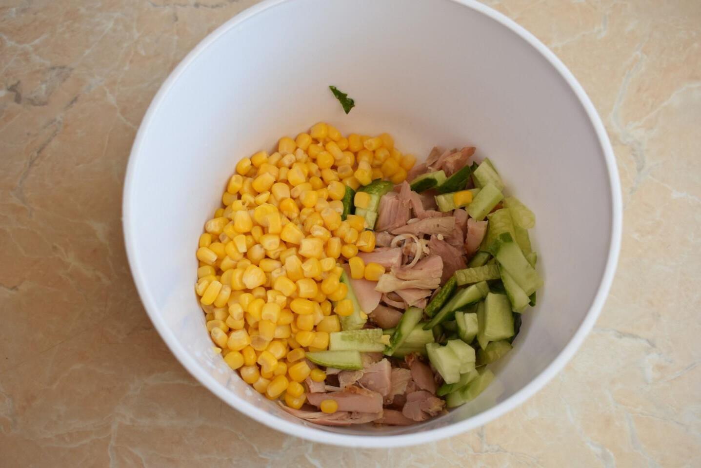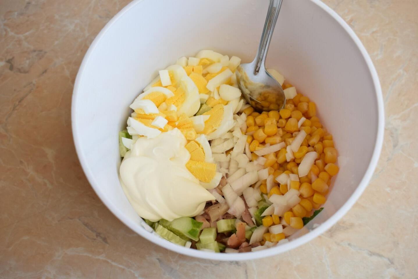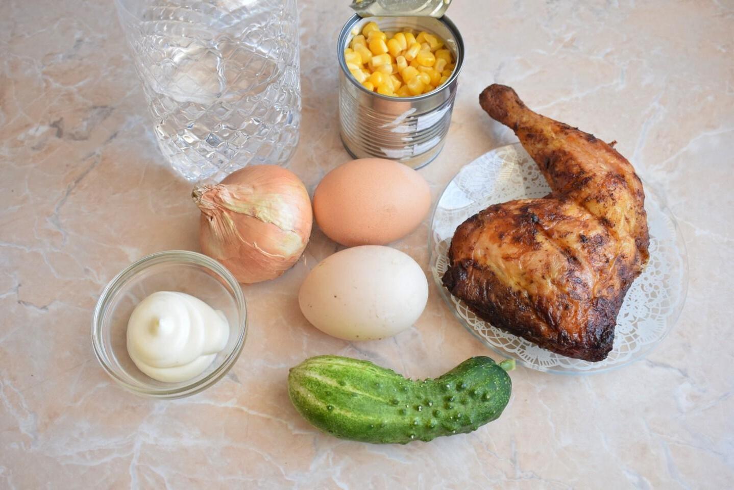 In a hurry, from ordinary products, a holiday every day! Smoked chicken and corn salad is very easy to prepare. You can prepare it on a regular day, as a snack or dinner, or for a holiday table, beautifully arranged in layers in a ring.