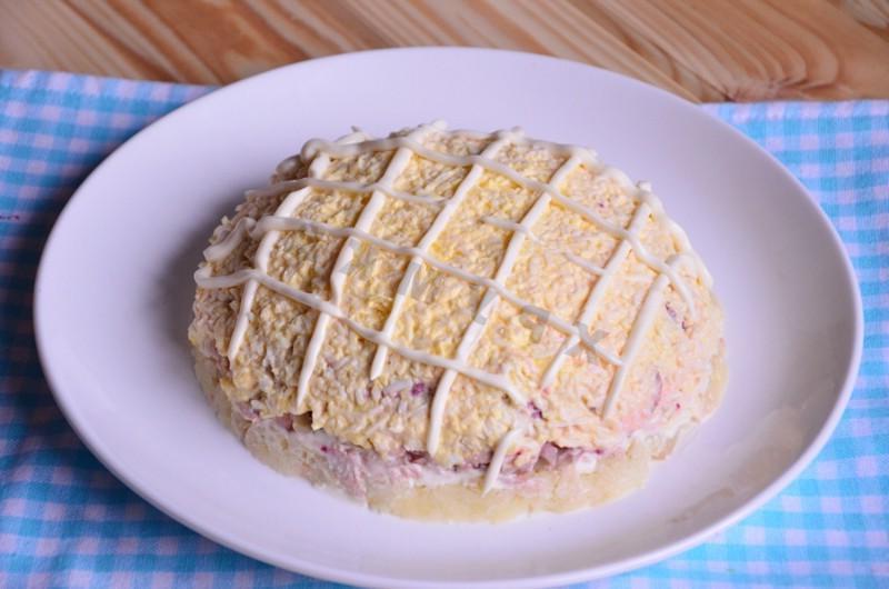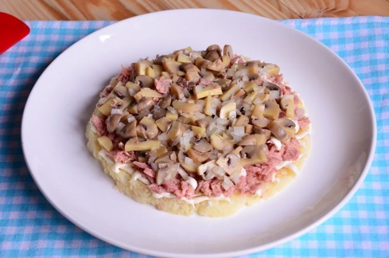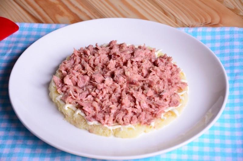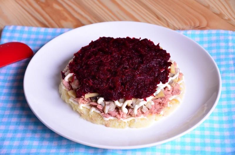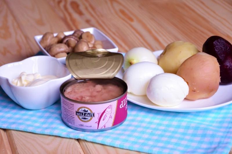 A bright salad will decorate your New Yearʼs table! Delicious, bright and beautiful salad. If you donʼt have pickled mushrooms in stock, use pickled cucumbers — they will also work great. Instead of canned tuna, you can use other canned fish, it will be just as tasty.