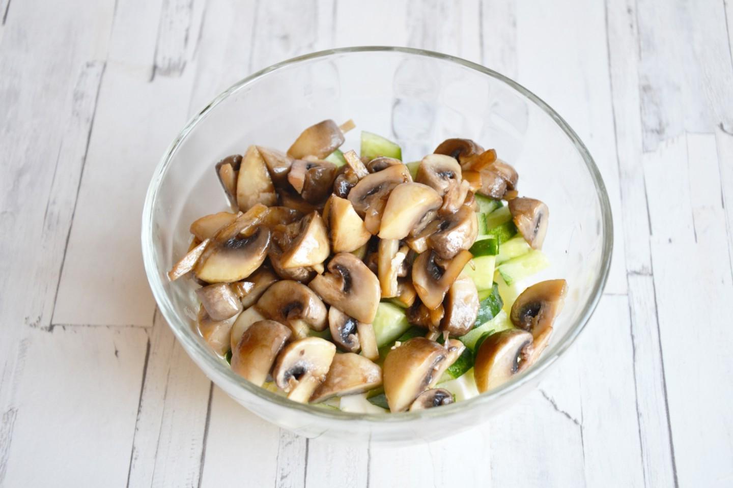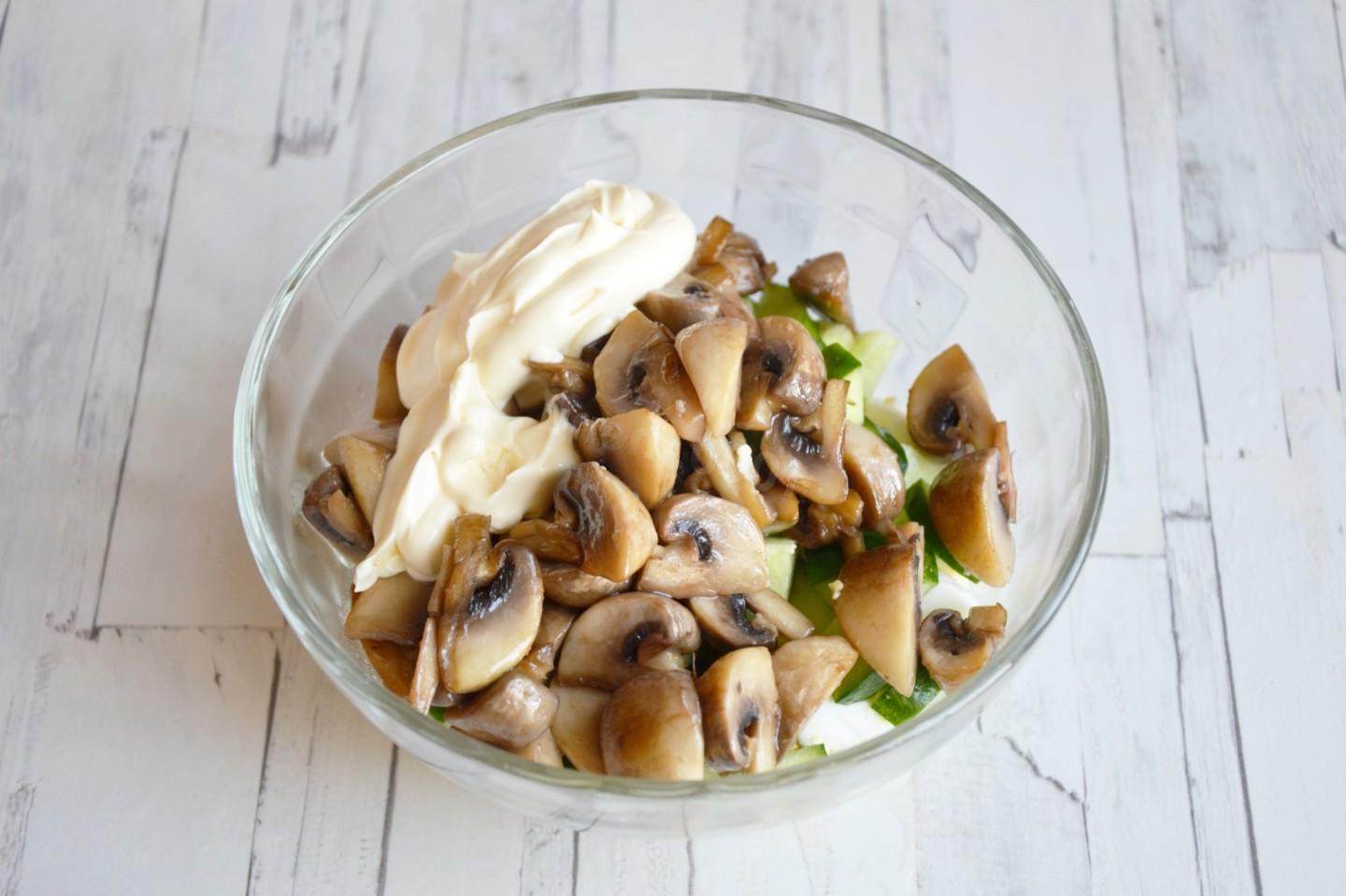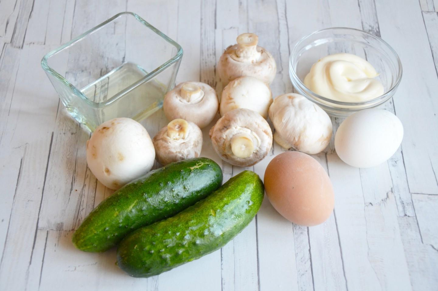 Fast, simple, delicious, whipped up! A salad with fried champignons, cucumbers and eggs is prepared from simple ingredients, but it turns out hearty and very tasty. It will take very little time to prepare it. The salad can also be served for a holiday by laying it out in layers in a ring.