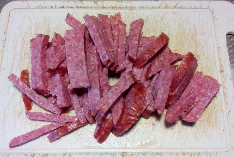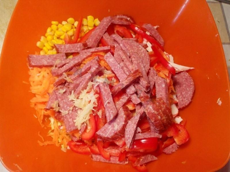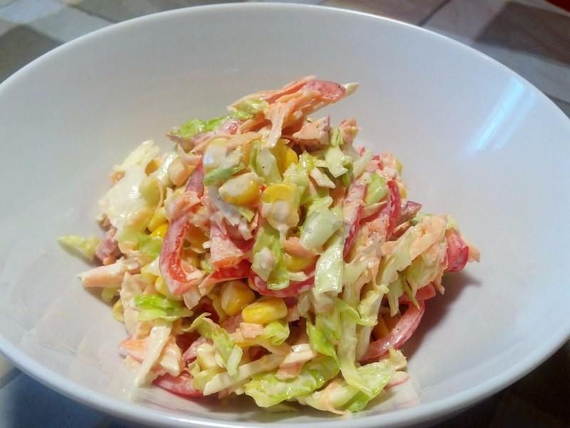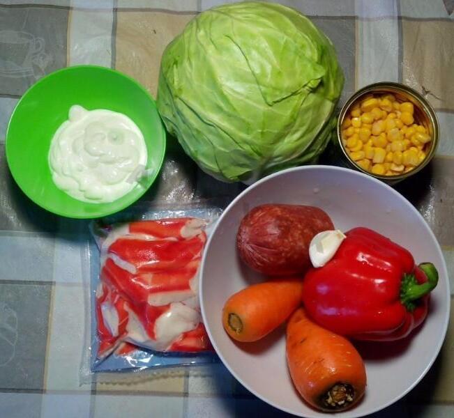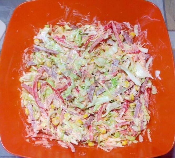 This tasty and satisfying salad can serve as a table decoration! Despite the somewhat “prosaic” name, this salad has an unusual combination of flavors. It will look great as an addition to hot dishes or as a separate dish in an everyday meal, and will also be suitable as a dish for a feast. The salad prepares very quickly: you don’t need to cook or fry anything. Just cut, mix — and you can serve!