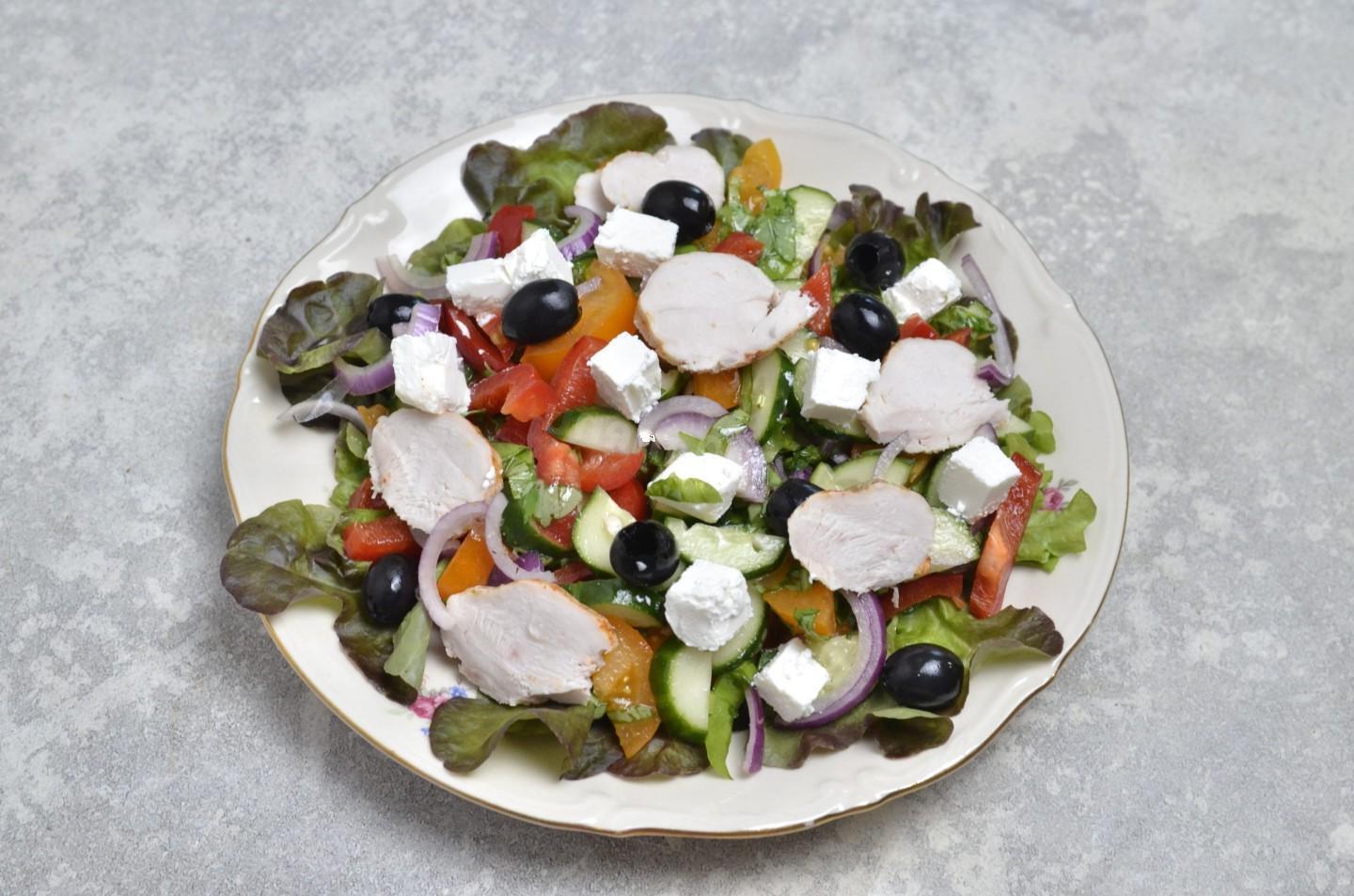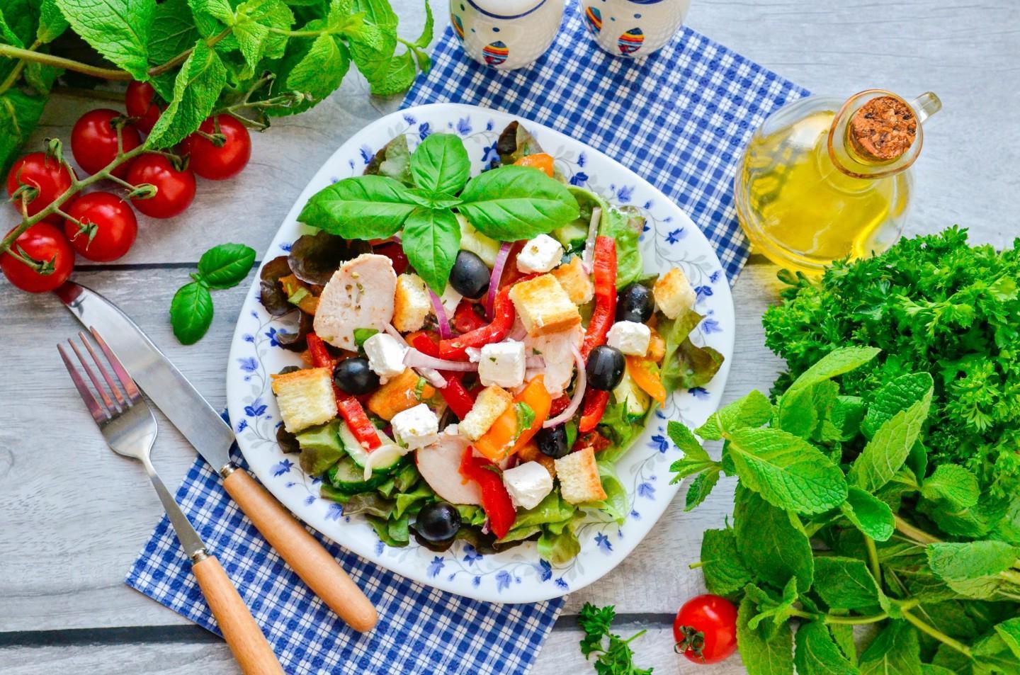Original, tasty, juicy, bright, healthy! Greek salad with croutons and chicken is an unusual version of the popular salad. Adding baked chicken breast makes it more filling, and the croutons add an interesting twist. This salad can easily replace dinner.