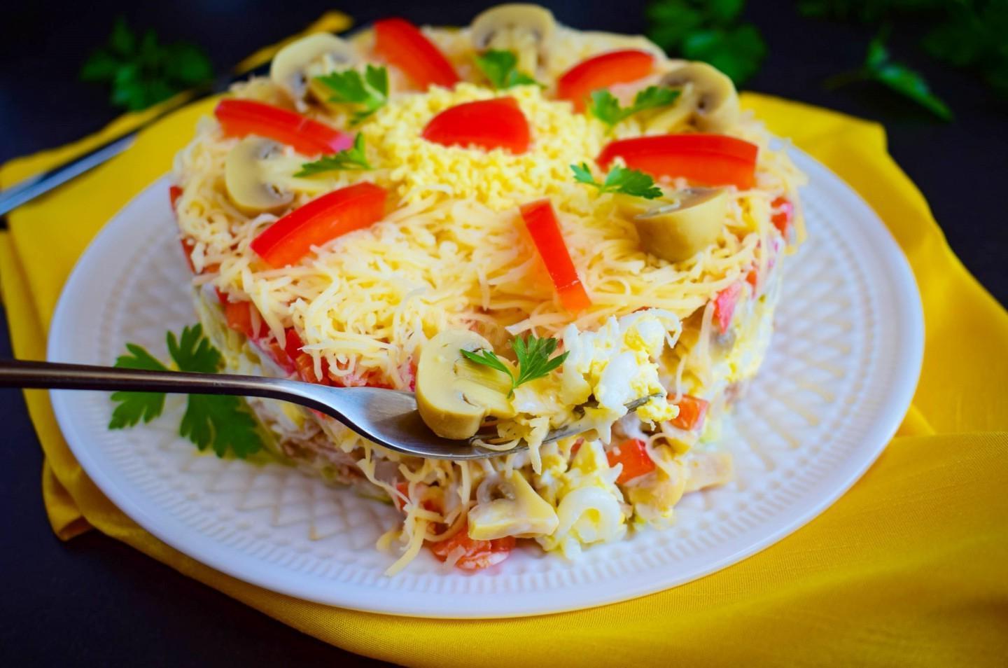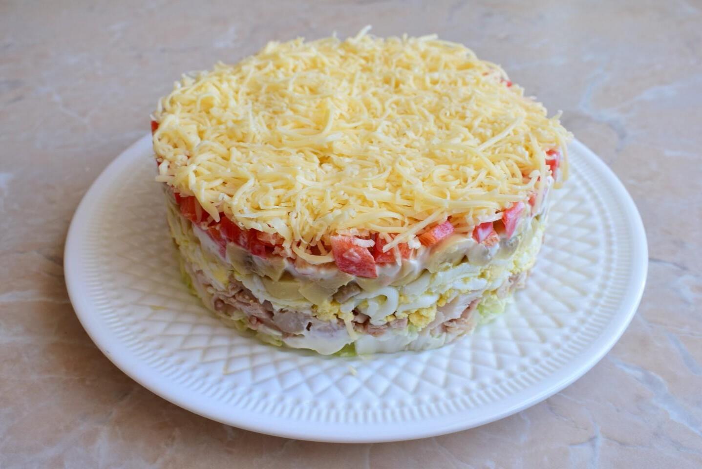 Very tasty, simple, bright and appetizing, for the holidays! You can prepare an awesome salad with Chinese cabbage in 15 minutes. Give it time to soak well and you can put it on the festive table! Smoked chicken adds piquancy to it. And cooking couldnʼt be easier!