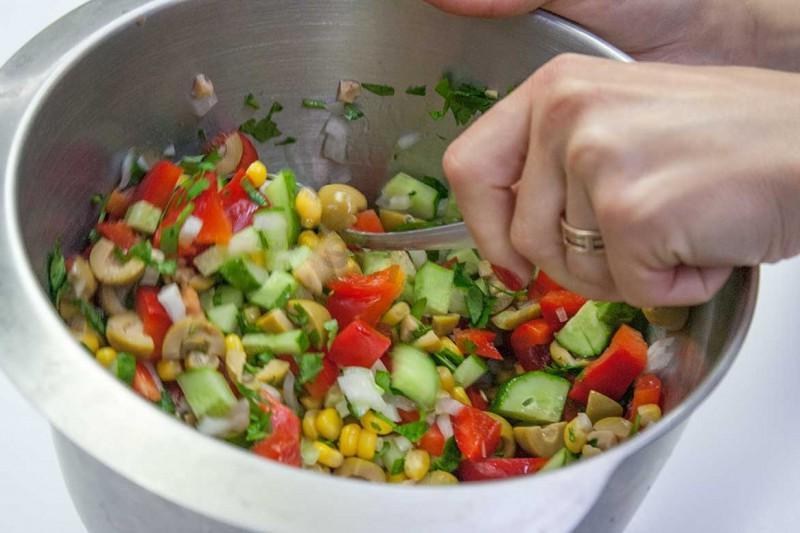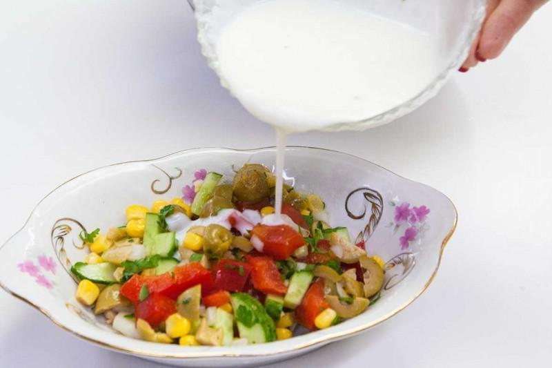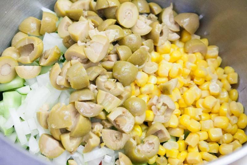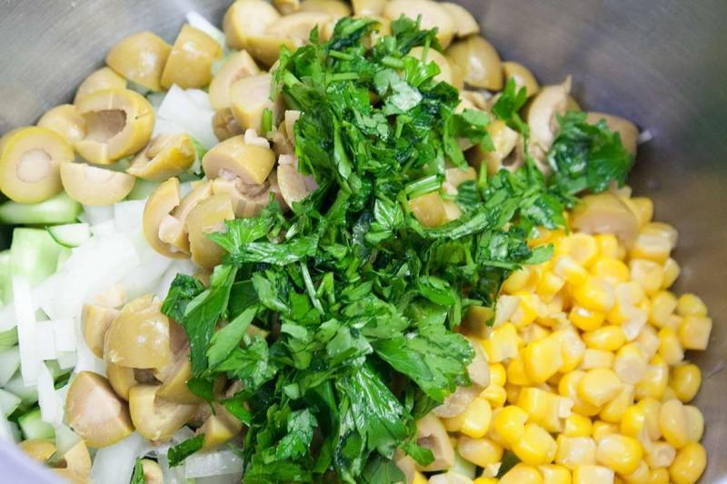 A salad for those who love something spicy and spicy! I prepared a vitamin salad with pepper for lunch. When you start eating, you immediately feel the savory taste of the olives, which turns into the sweetness of the corn, and only then the spiciness in the aftertaste.