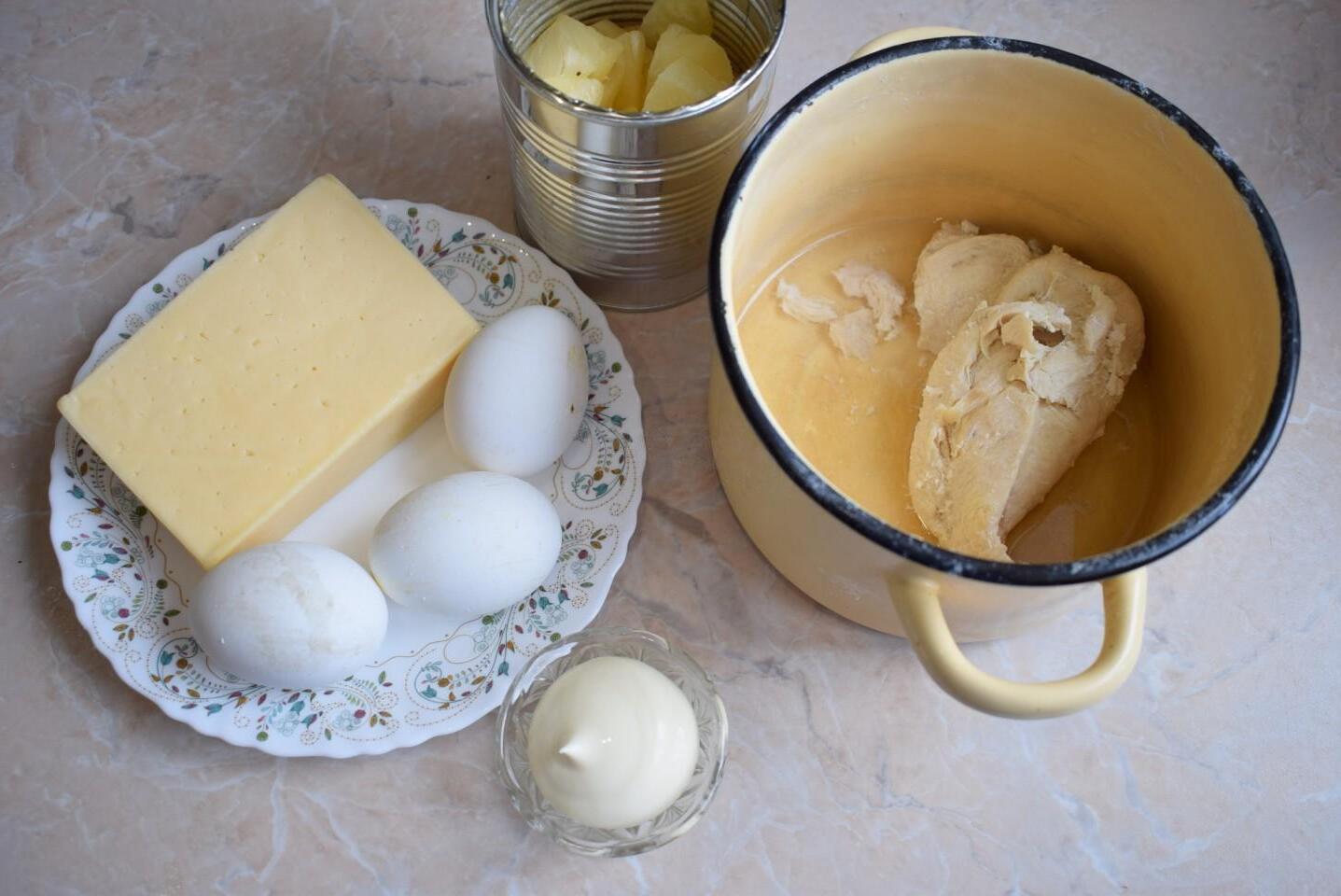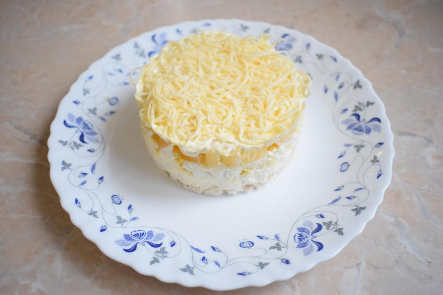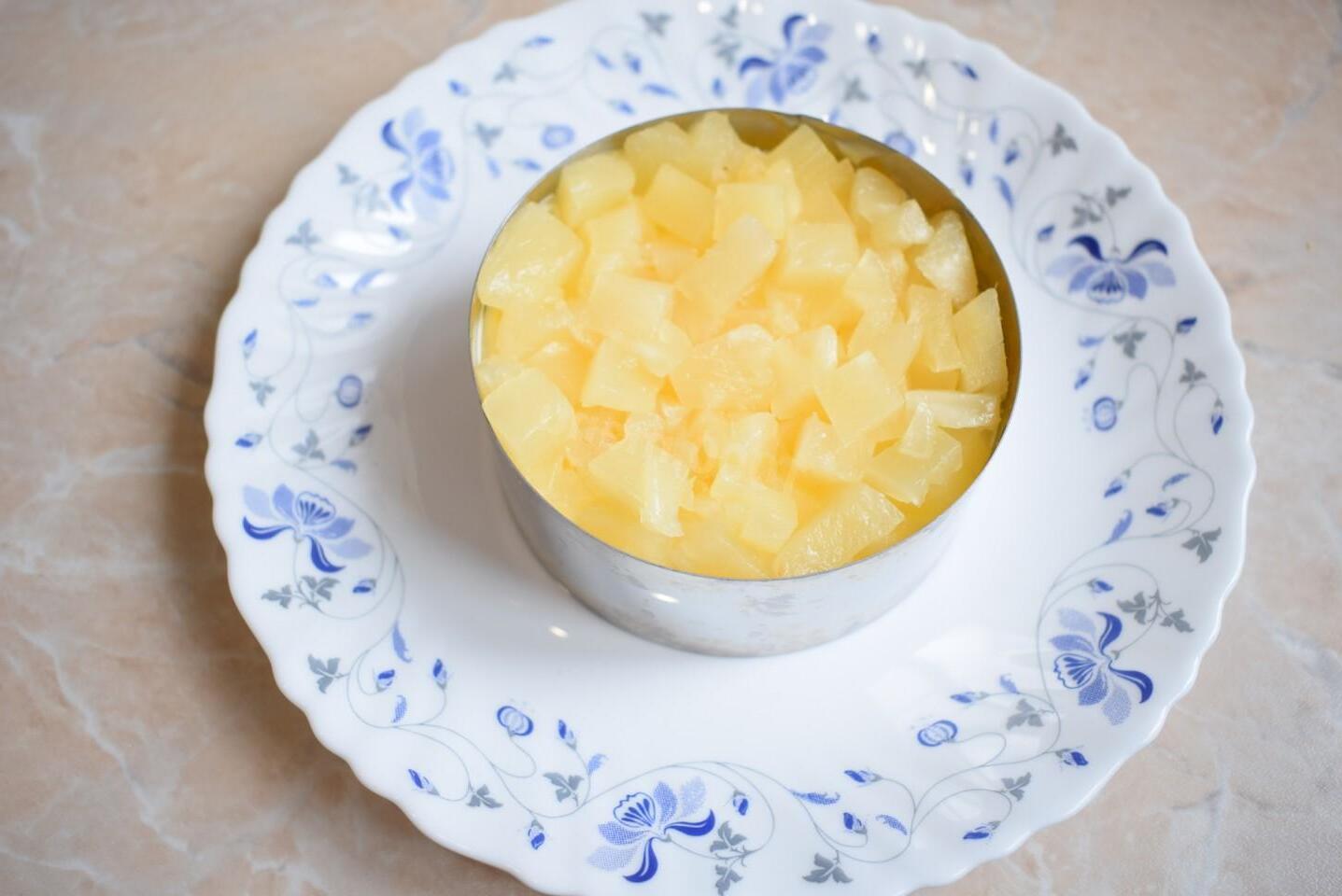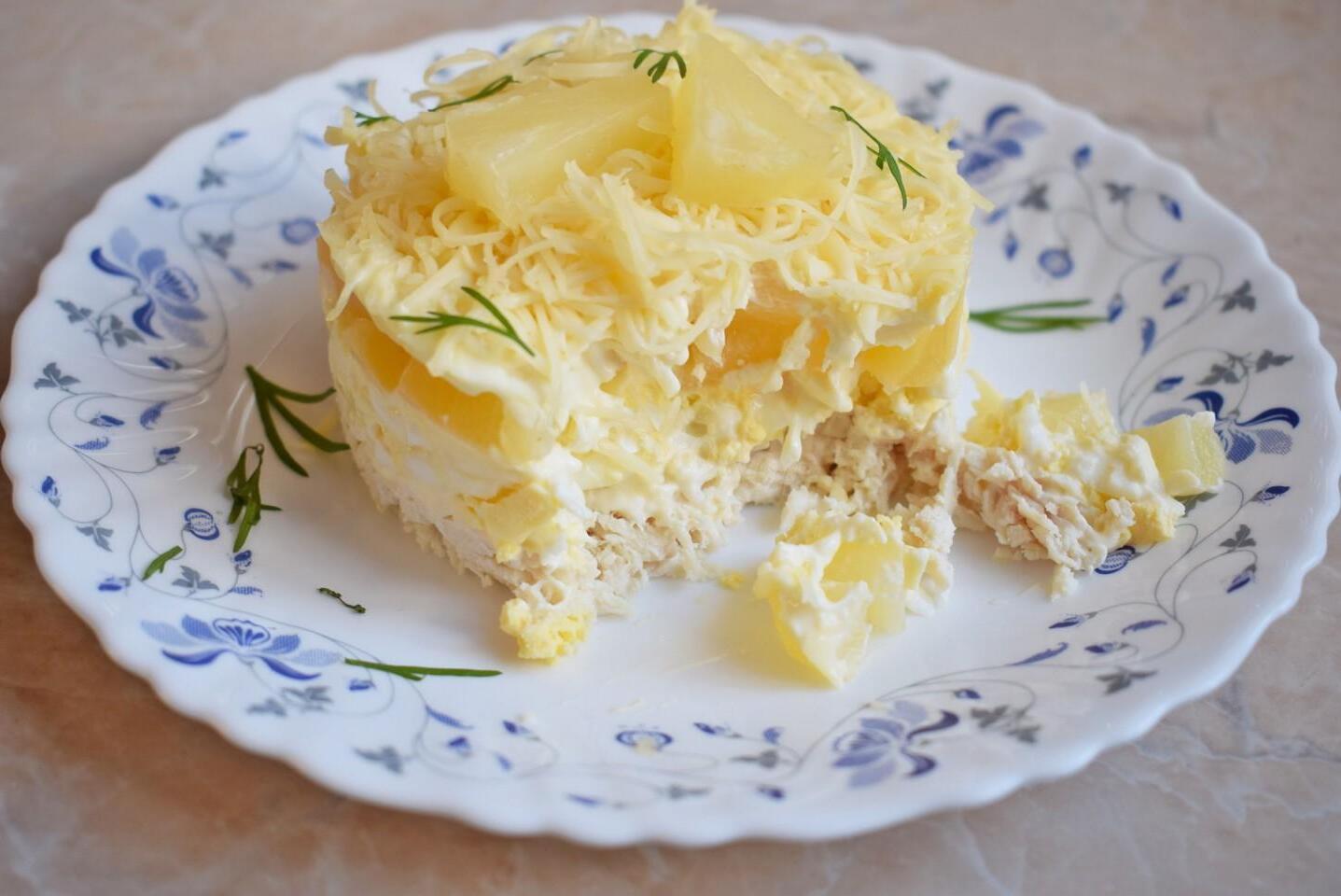 A very unusual salad for any feast! I like to prepare salads with the addition of various fruits, including pineapples. In my opinion, pineapples lighten the taste of the salad and make it juicy. And their sweetness harmonizes perfectly with the other ingredients.