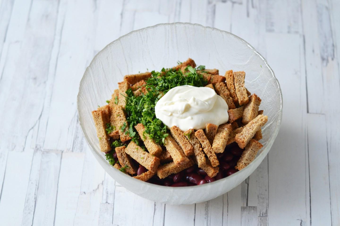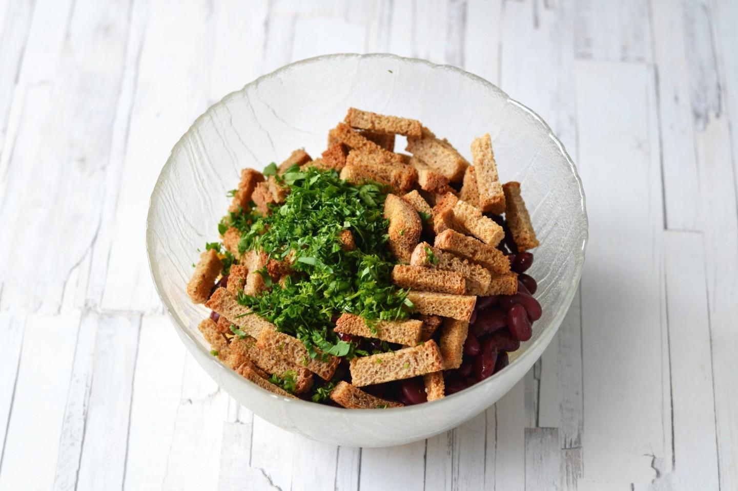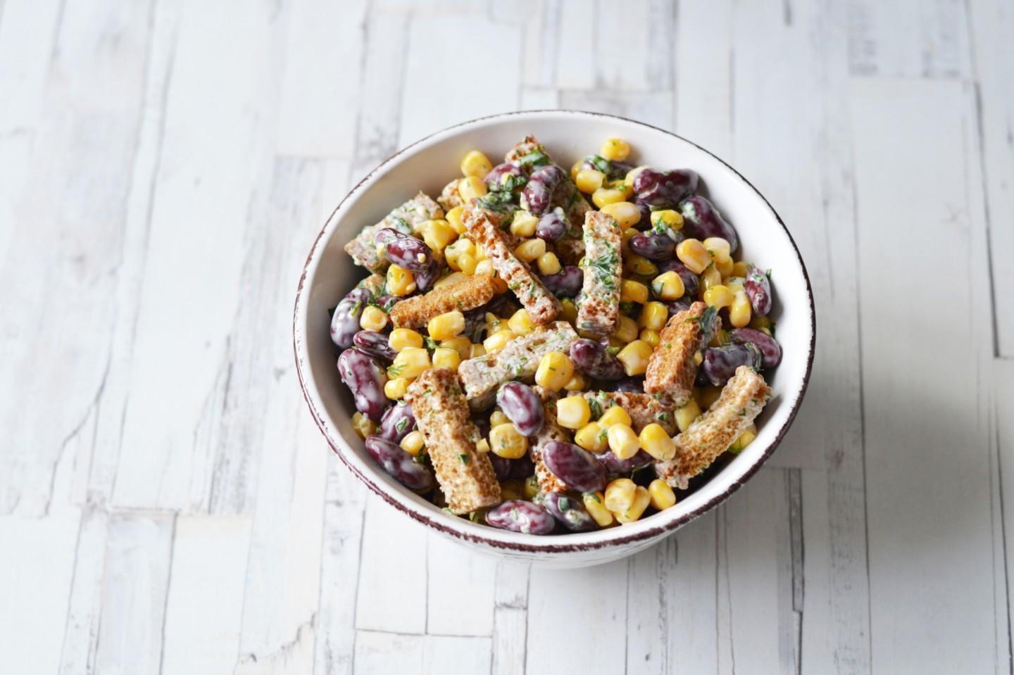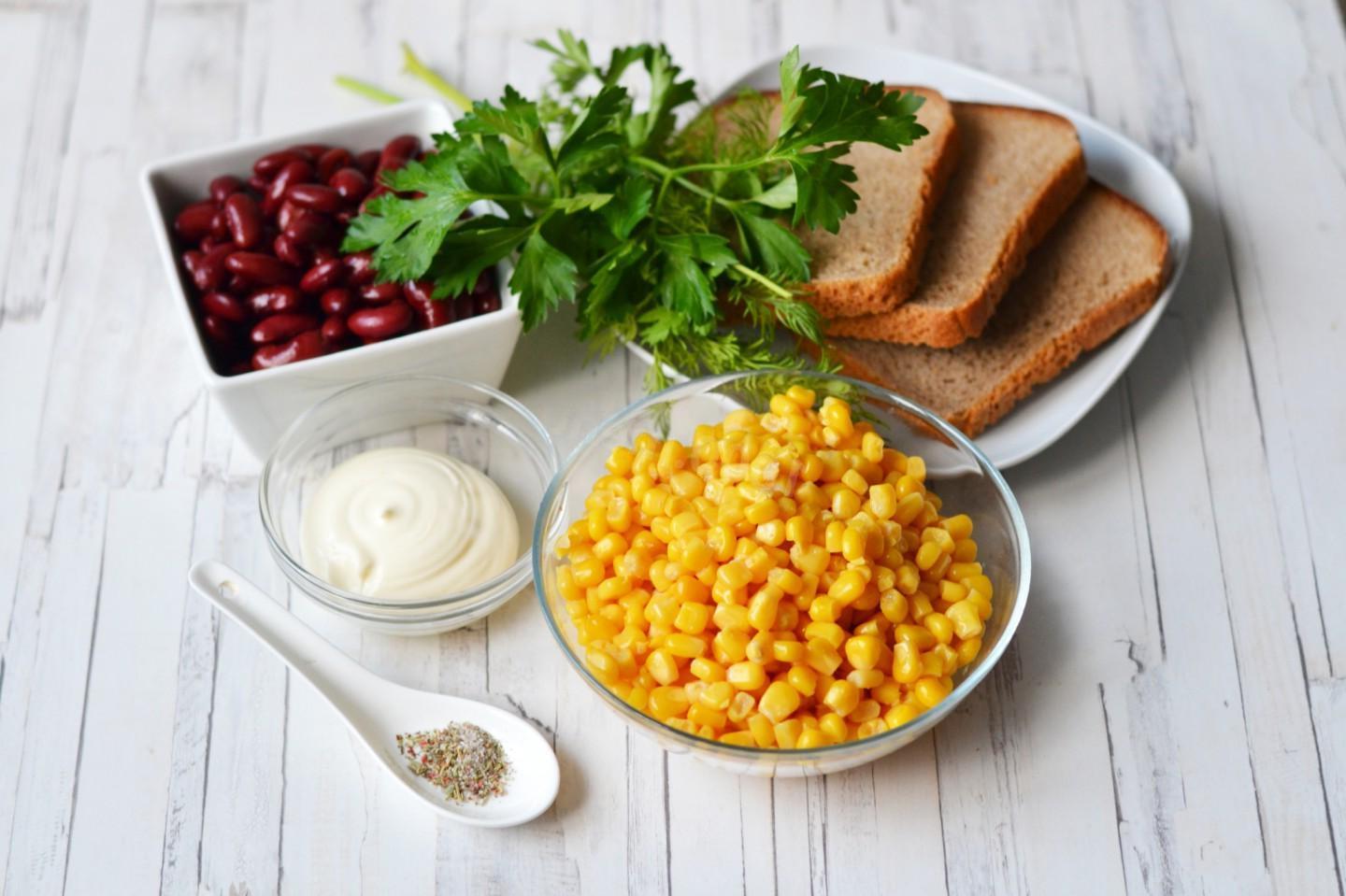 Simple, but tasty and satisfying, in a hurry. Despite the small number of ingredients, a bean and corn salad with croutons turns out to be quite nutritious. Making it will not be difficult, and it will take very little time, especially if you already have ready-made crackers.
