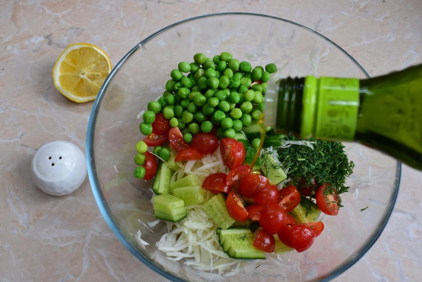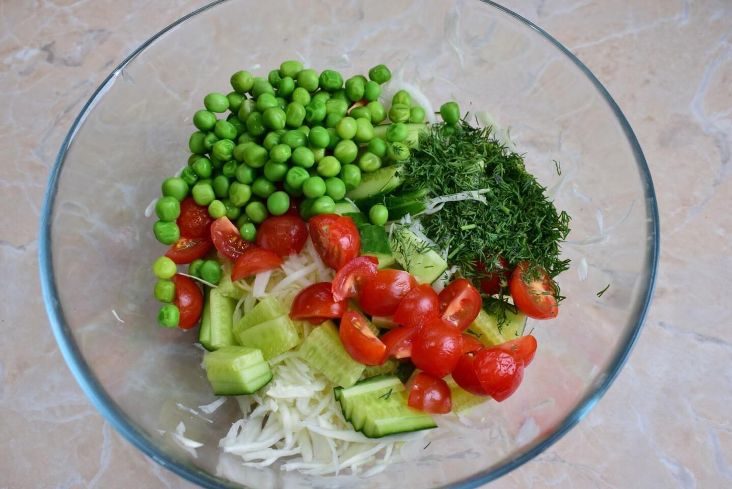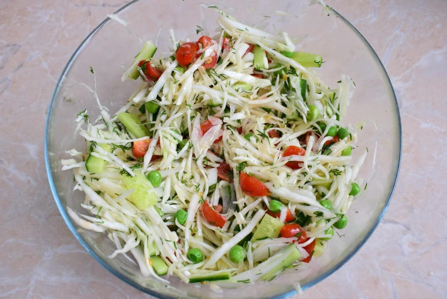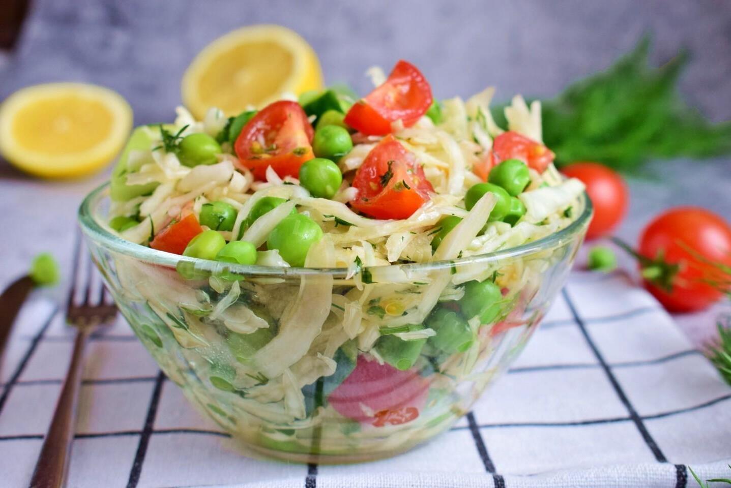 Tasty and healthy, made from simple ingredients, no mayonnaise! Cabbage salad with green peas is so simple, light and tasty that it will come in handy at any table. It can be served for breakfast, dinner, or on a holiday table. It is good on its own and in combination with meat dishes.