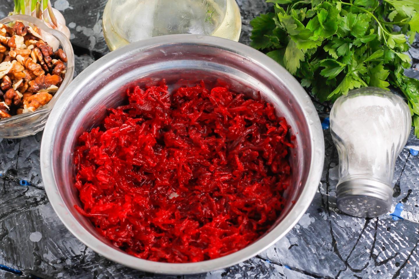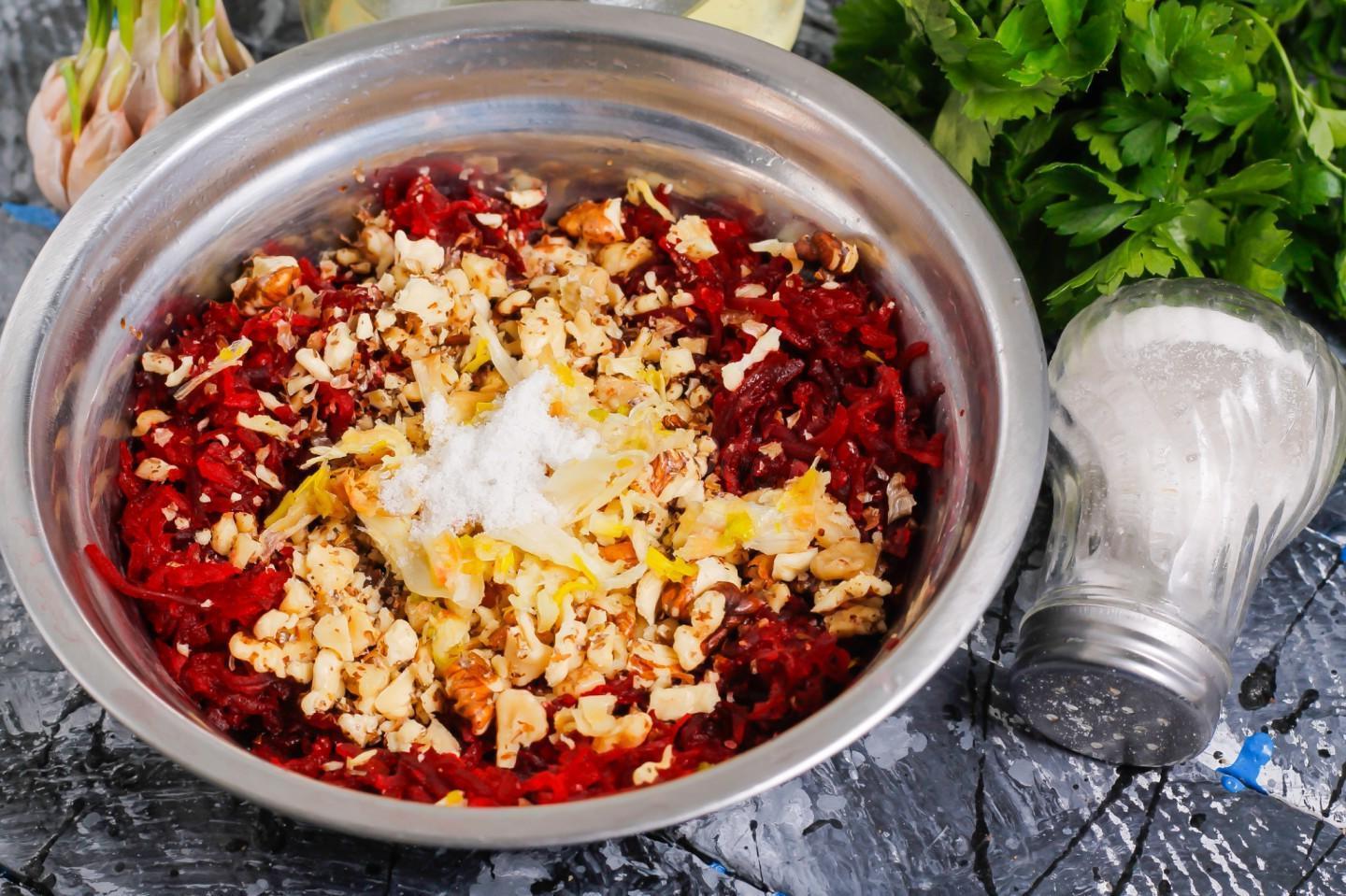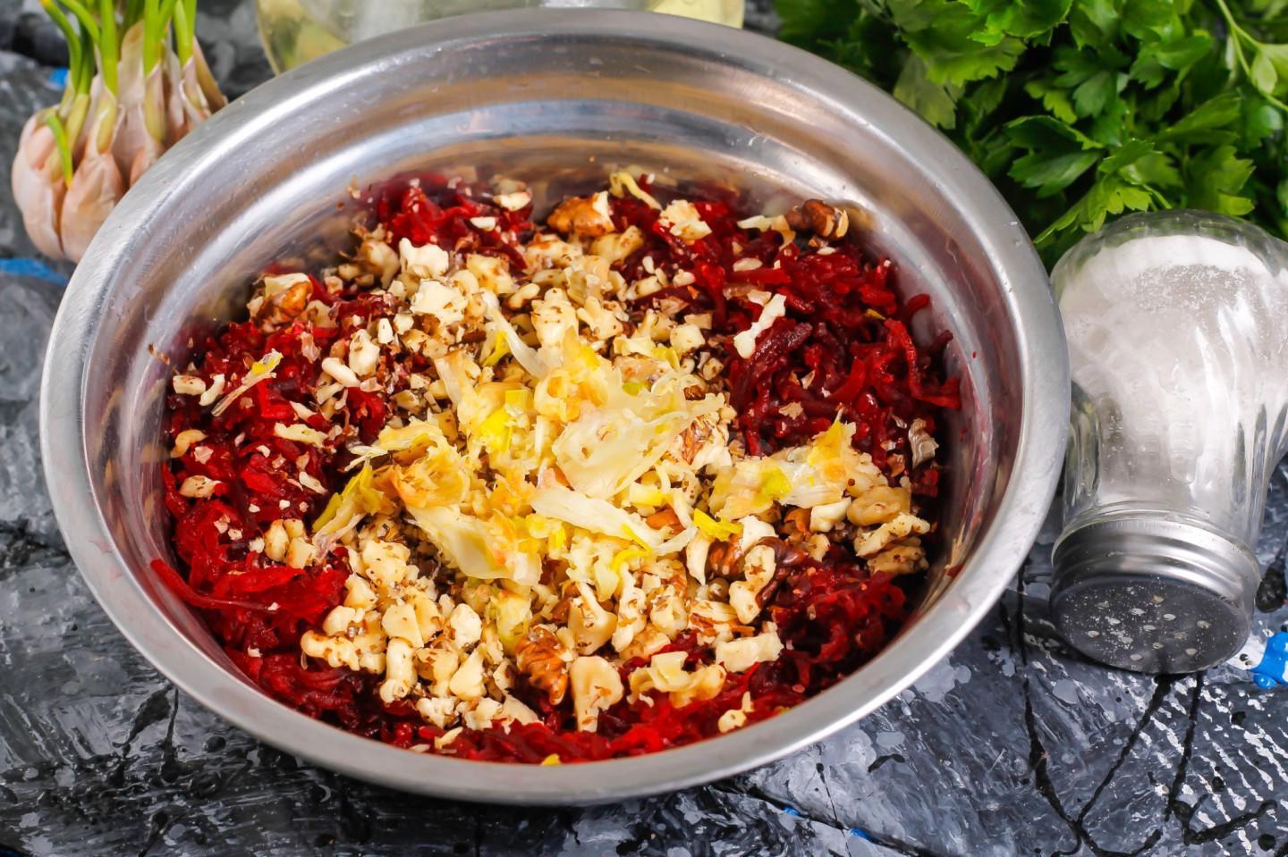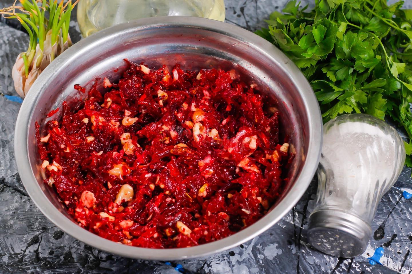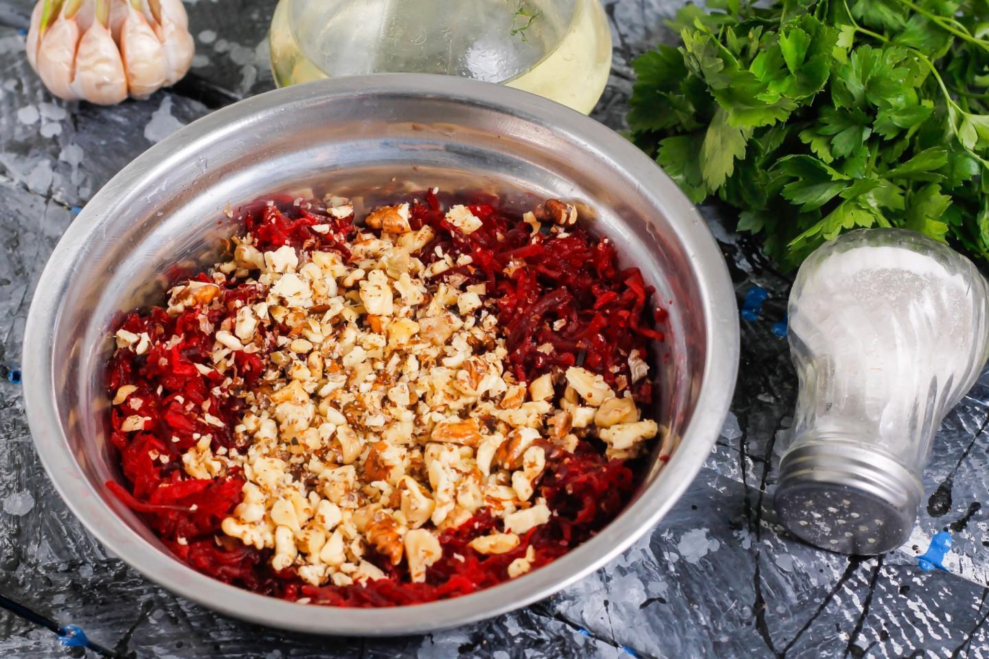 Juicy and piquant — beet salad with garlic and nuts. The dish can be served with sour cream or thick yogurt without additives, with baked or boiled meat, fish, as an independent snack. Sometimes steamed prunes are added to the salad for a velvety taste.