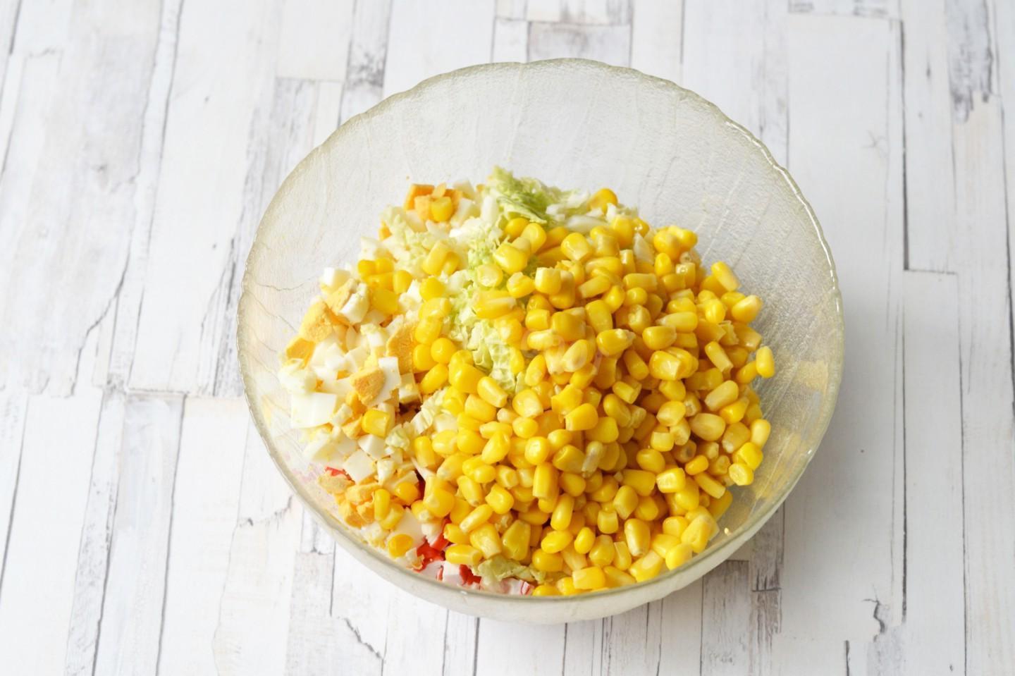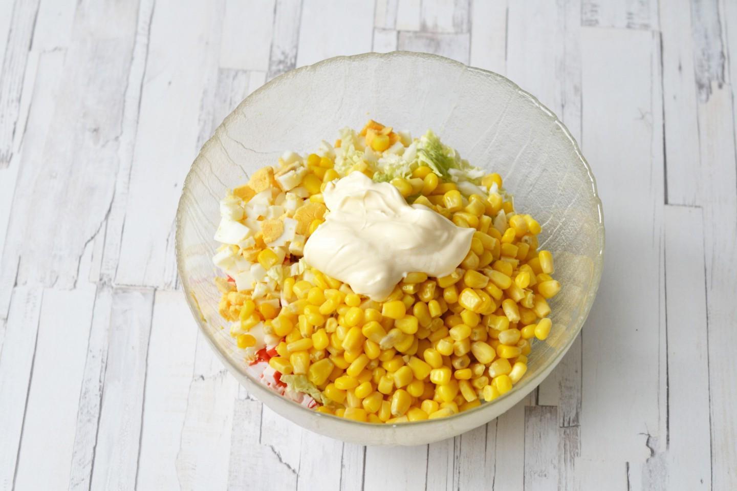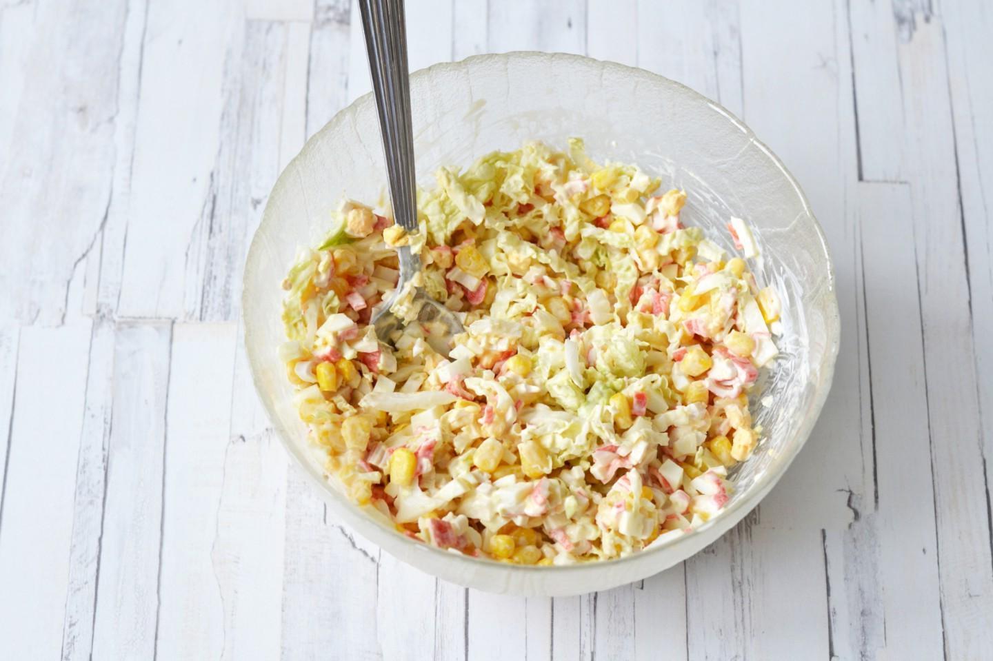 Fast, easy, from affordable products. You can make a salad with Chinese cabbage, crab sticks and corn in a matter of minutes, and it tastes just as good as complex dishes. To make the salad even more satisfying, you can add a little boiled fluffy rice to it.