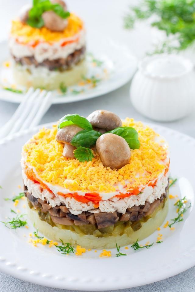 Incredibly tasty and beautiful. Not a single holiday without him! The Fairy Tale salad with chicken and champignons is made from ordinary ingredients, but it turns out very elegant and appetizing. This salad can be made for a family dinner, or you can also treat it to guests — everyone will be full!