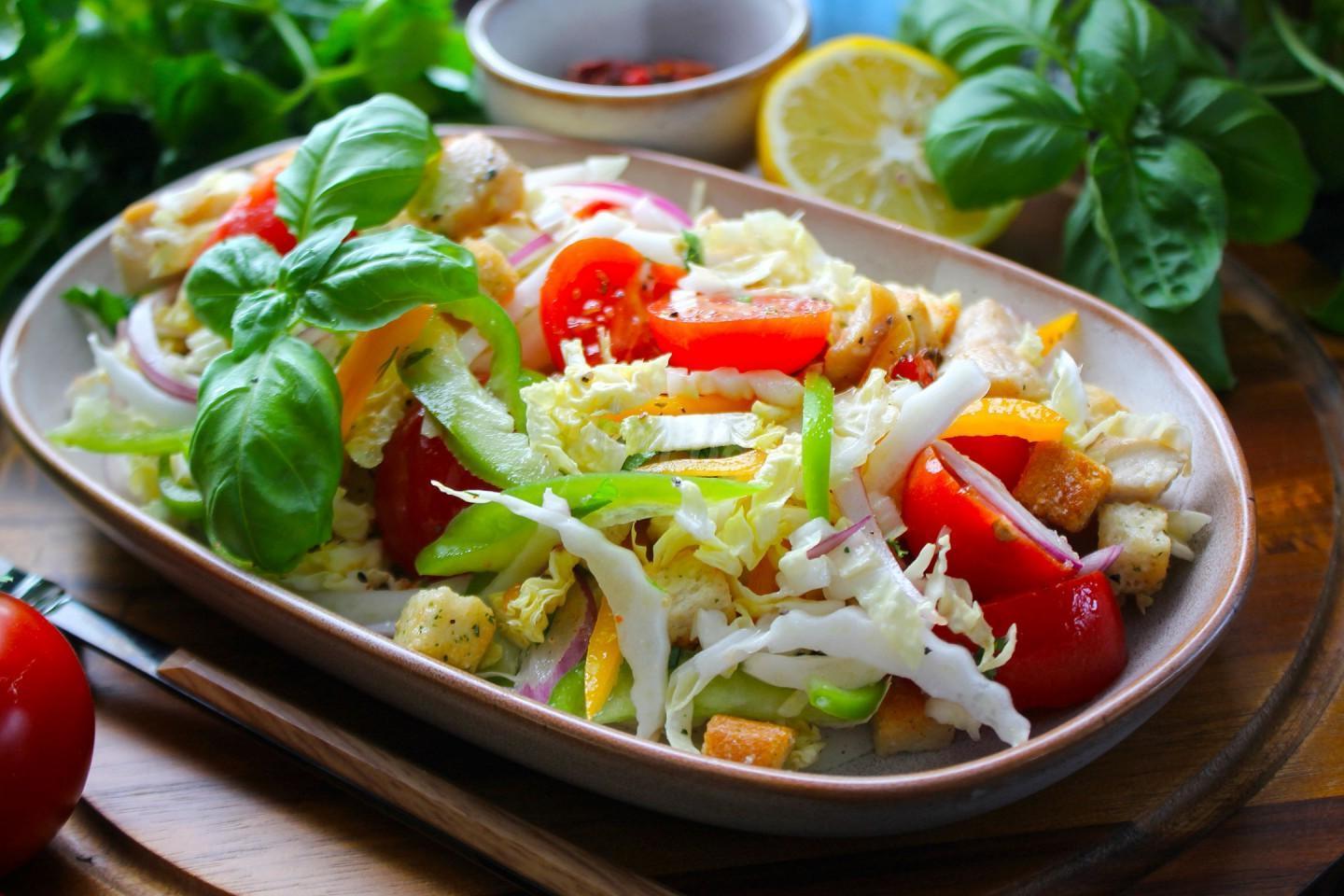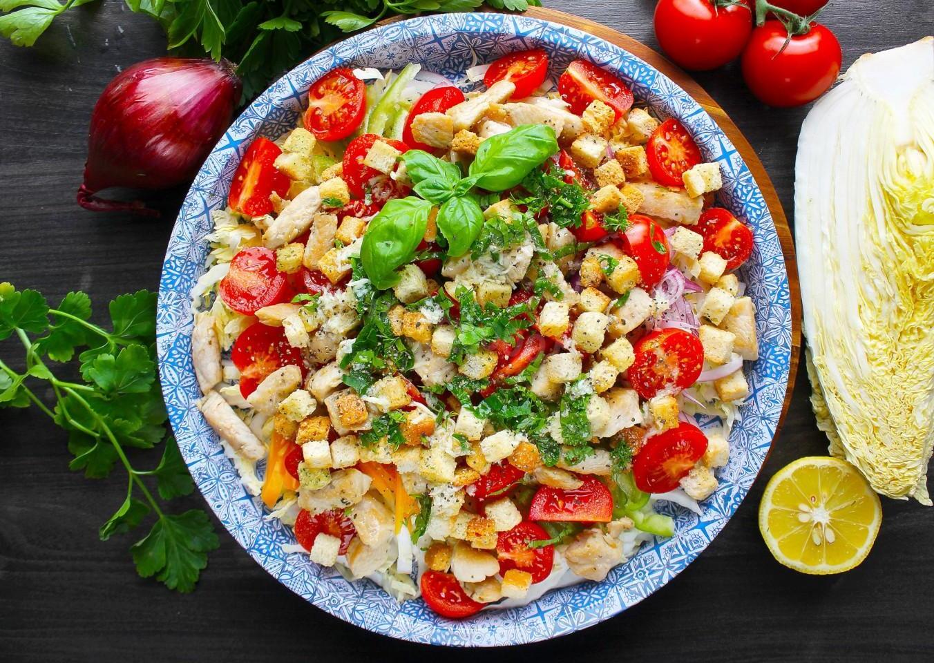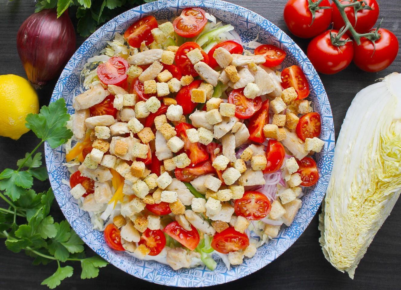 Insanely delicious, easy, simple, quick, without mayonnaise! Chinese cabbage salad with chicken, croutons and tomatoes is a real storehouse of vitamins. It is bright, fresh, juicy, tasty, and very healthy. You will have it ready in 15 minutes. This salad is perfect for a late dinner!