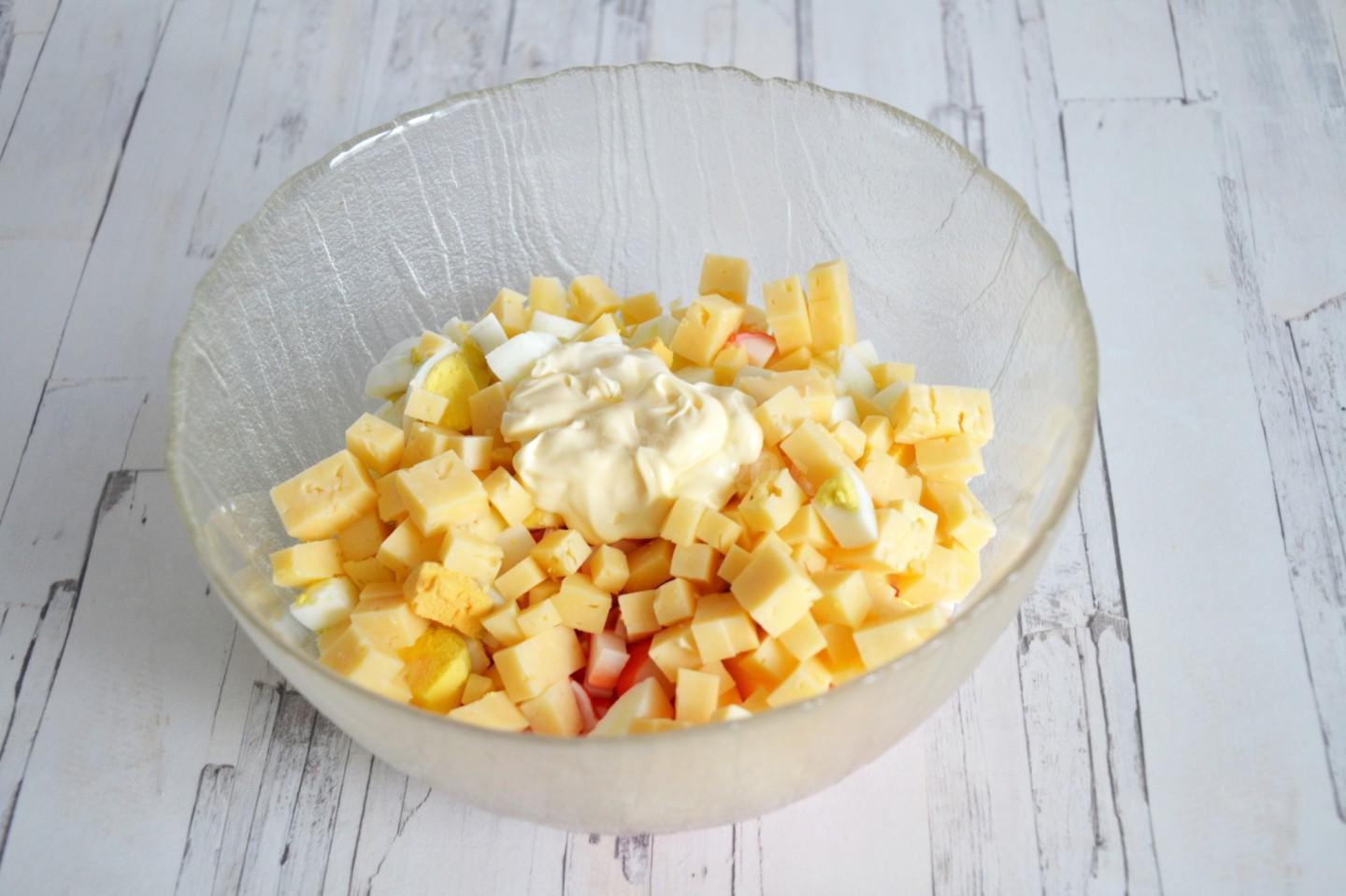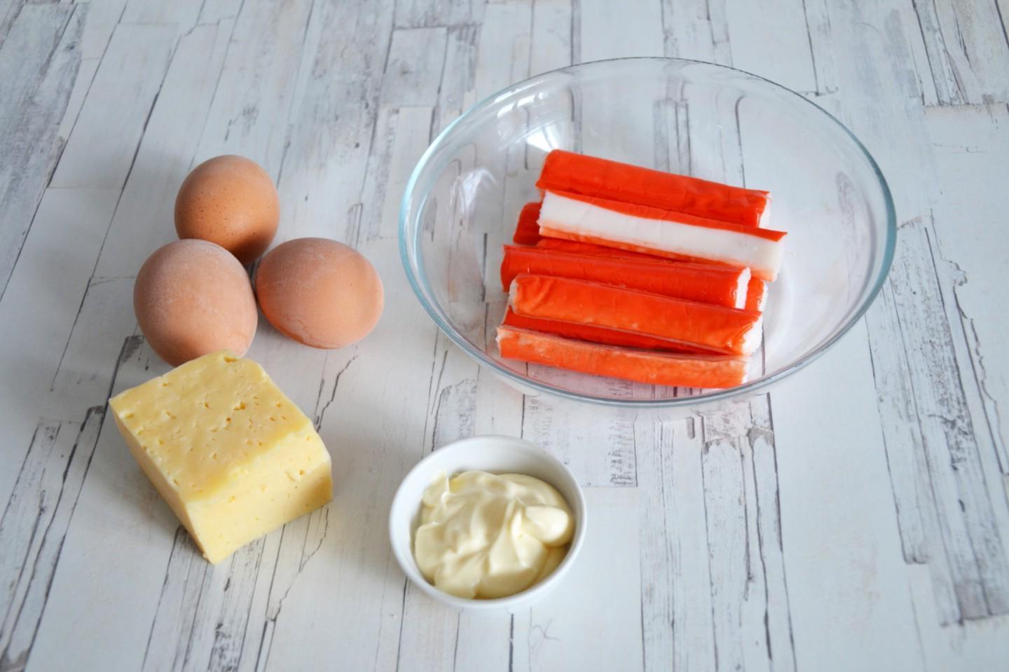 Very simple, fast and inexpensive, for the whole family! Salad with crab sticks, cheese and egg — another version of everyoneʼs favorite crab salad. It contains only three ingredients, adding or varying others, you will get a new taste every time. Try it!