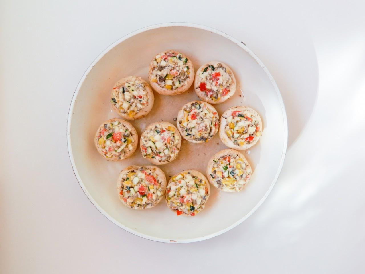 Mushroom and vegetable appetizer with rich taste! Champignons baked whole in the oven are not at all difficult to prepare. The combination of vegetables and garlic gives the dish an amazing aroma. The cheese softens the filling, and the garlic and Italian herbs add flavor. And this snack attracts with its bright appearance.