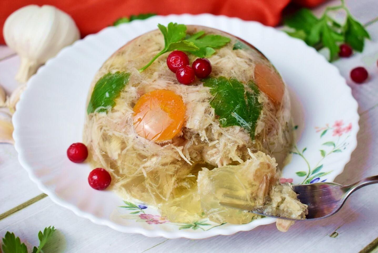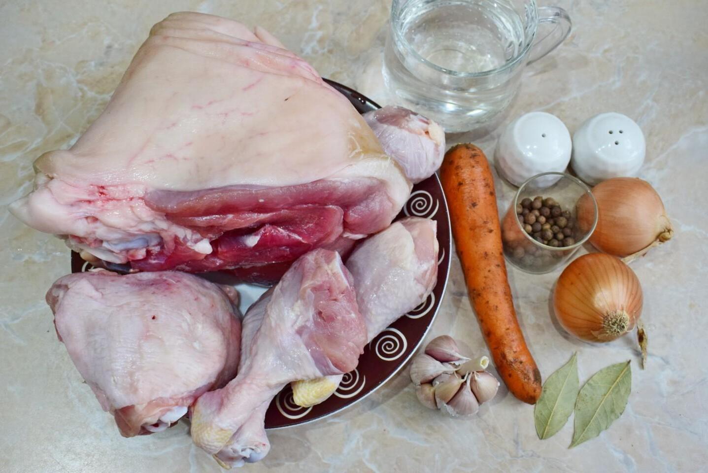 How to cook delicious jellied meat so that everyone will like it! Jellied meat from pork and chicken shanks is very rich and freezes well on its own. Therefore, adding gelatin to it is not required. The use of several types of meat makes the taste of jellied meat very rich, and the snack itself is less caloric.