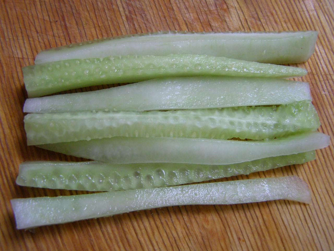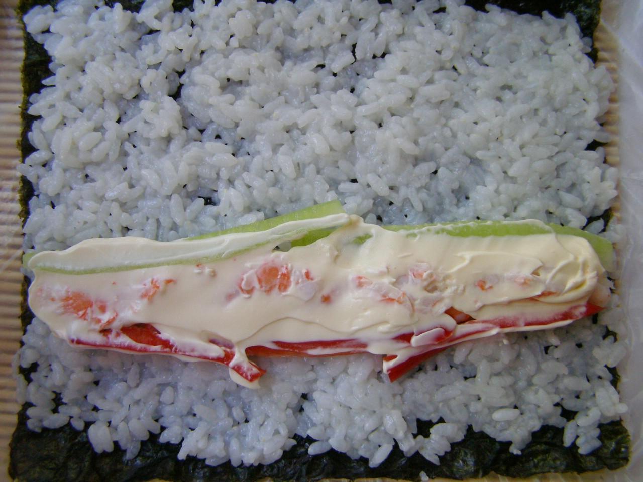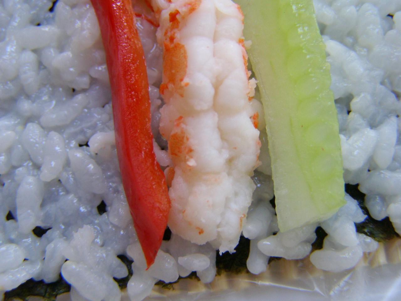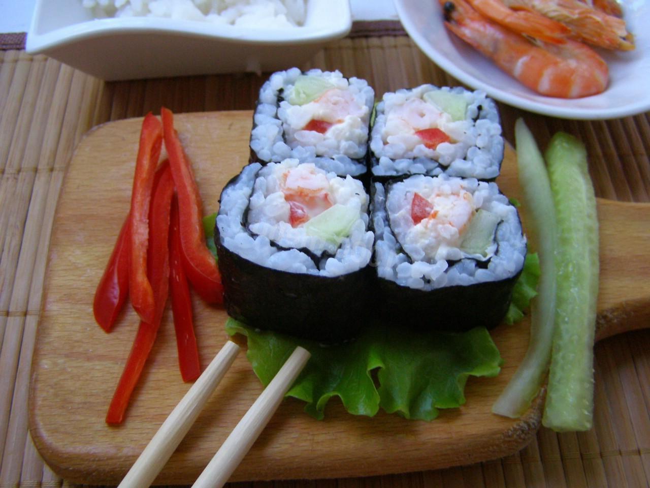 Shrimp and cucumber rolls are a fresh touch to your menu. It’s not only fresh because there’s cucumber in it. New dish. New taste. New moods. Once you try it, you’ll want to continue because rolls have a lot of variations and accents. Delicious and low-calorie gourmet food will soon be included in your diet. After all, it is suitable for any occasion. The rolls are cut into equal parts with a sharp knife. Served with soy sauce, pickled ginger and wasabi.