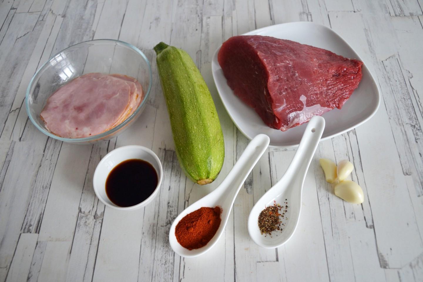 These rolls can be made from any meat. In this recipe I wanted to combine zucchini and ham with my favorite beef. It seemed to me that such a filling would provide juiciness to the rolls and I was not mistaken. In addition to ham, you can use any raw-smoked or cooked-smoked cut.