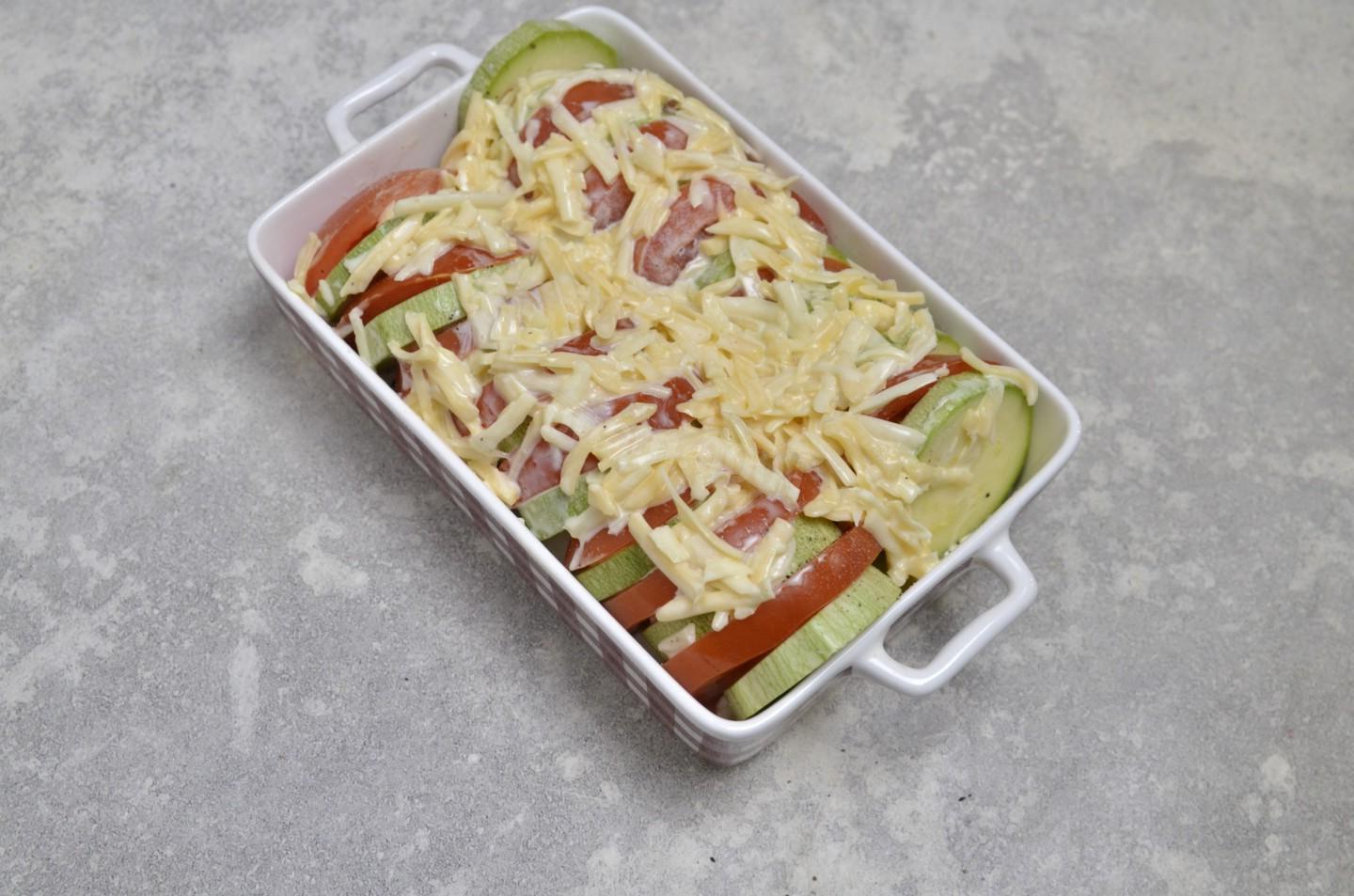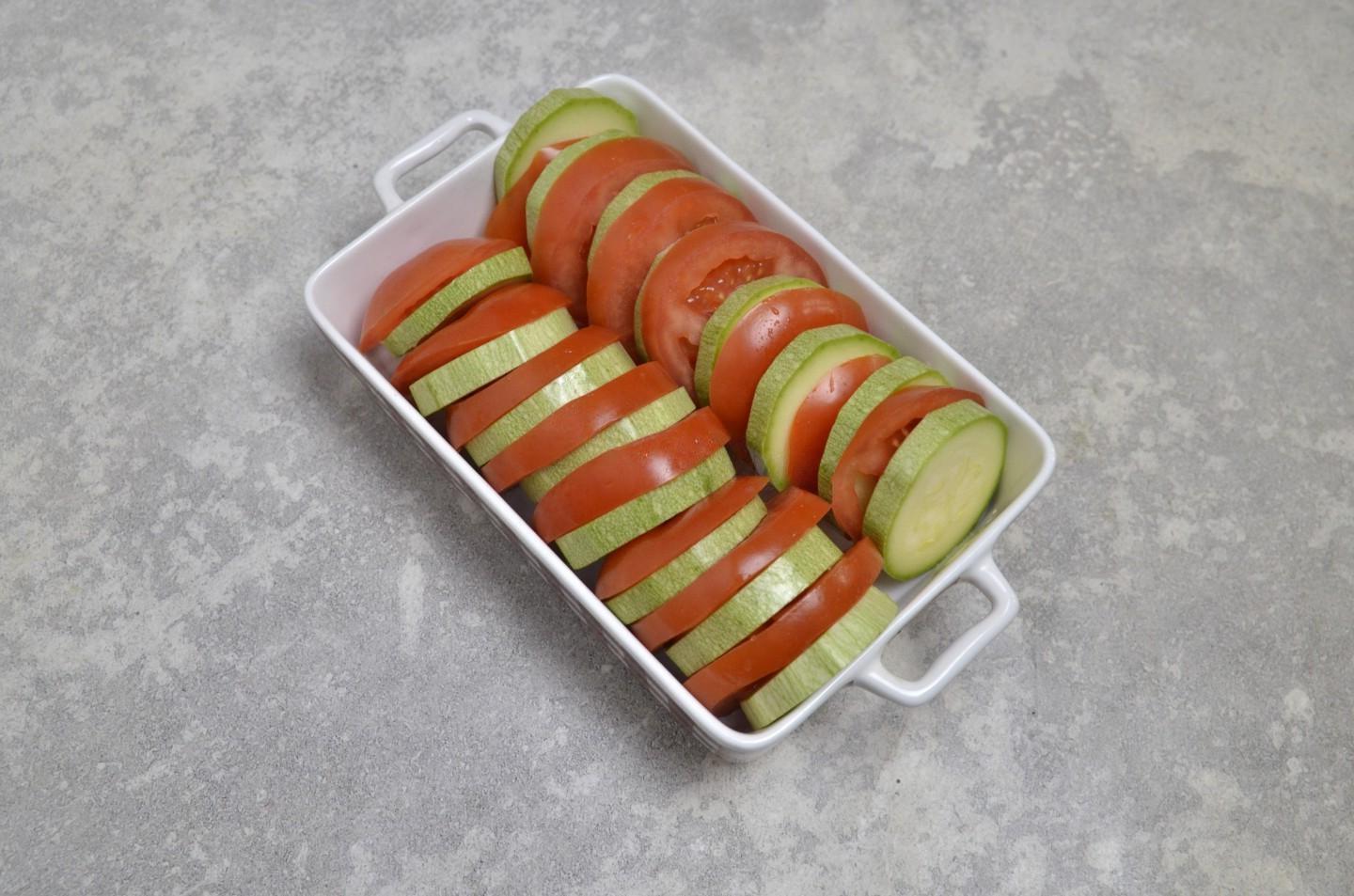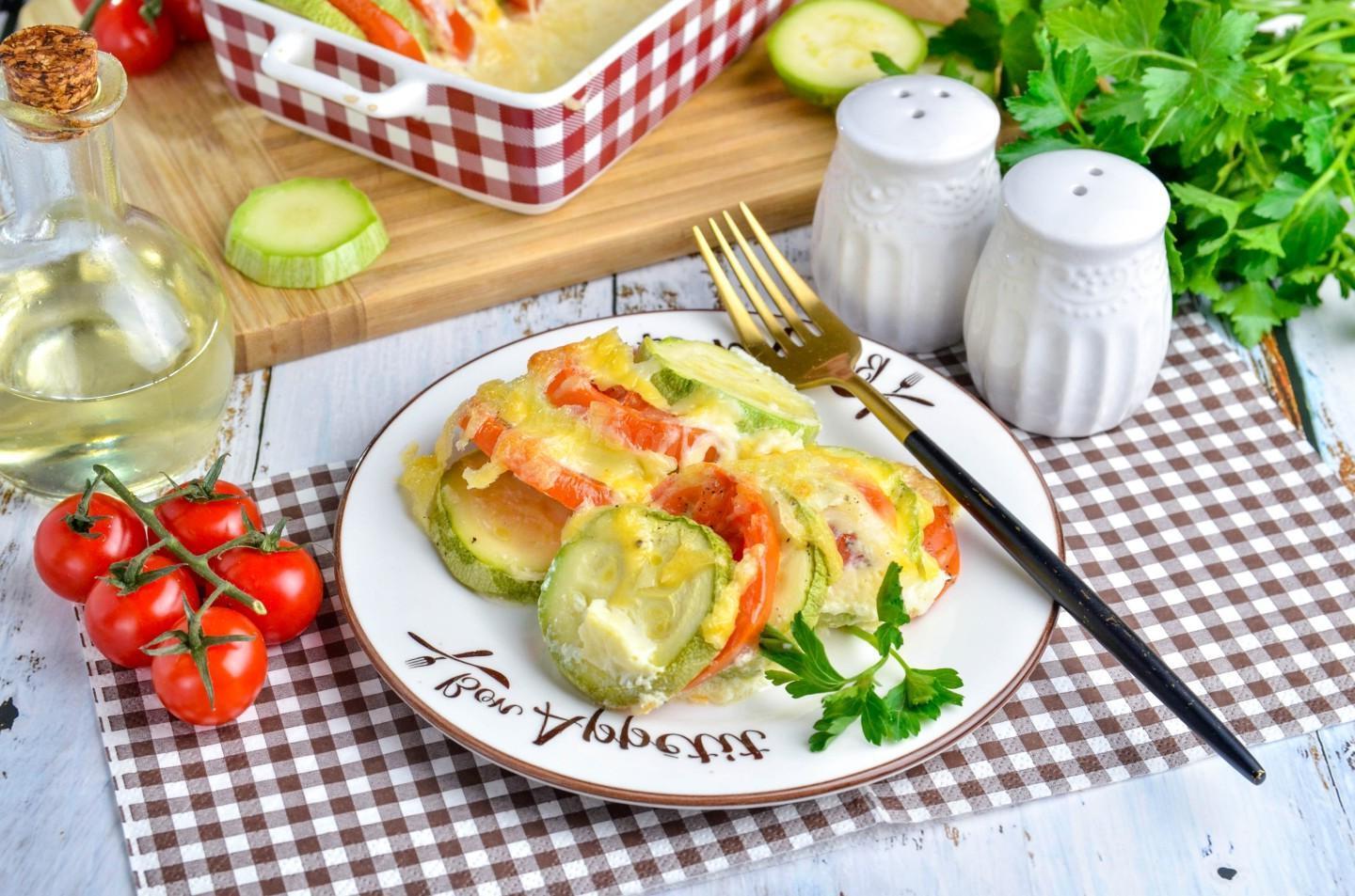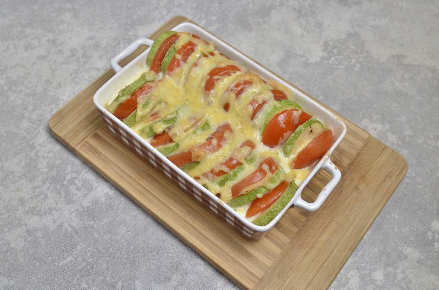 A bright and beautiful side dish for any meat or fish! Zucchini, tomatoes, cheese, garlic are baked in the oven, pre-cut into circles. Due to the interesting styling, the dish turns out to be very unusual in appearance. The creamy filling gives the vegetables a subtle taste, and the cheese a golden brown crust.