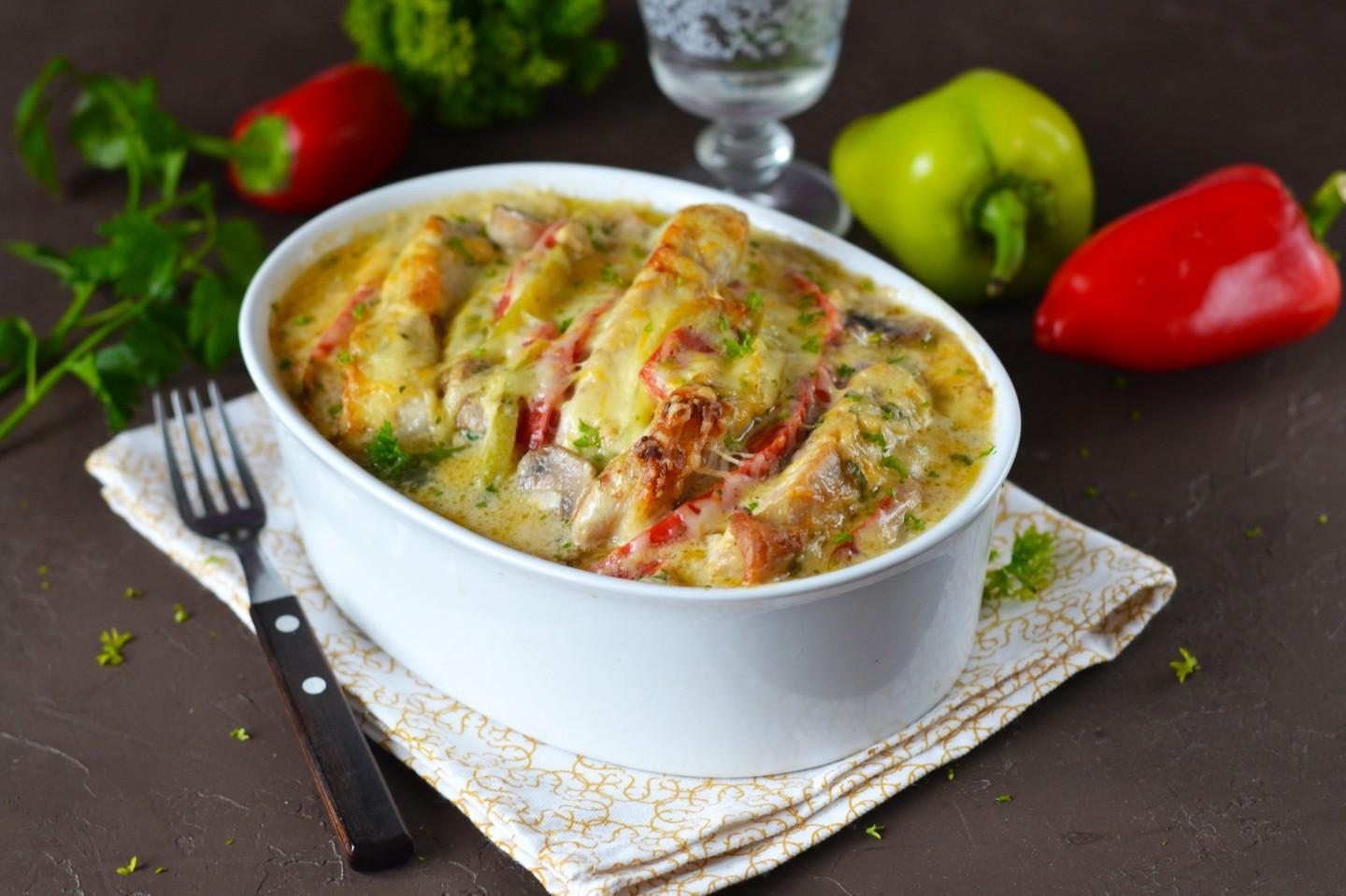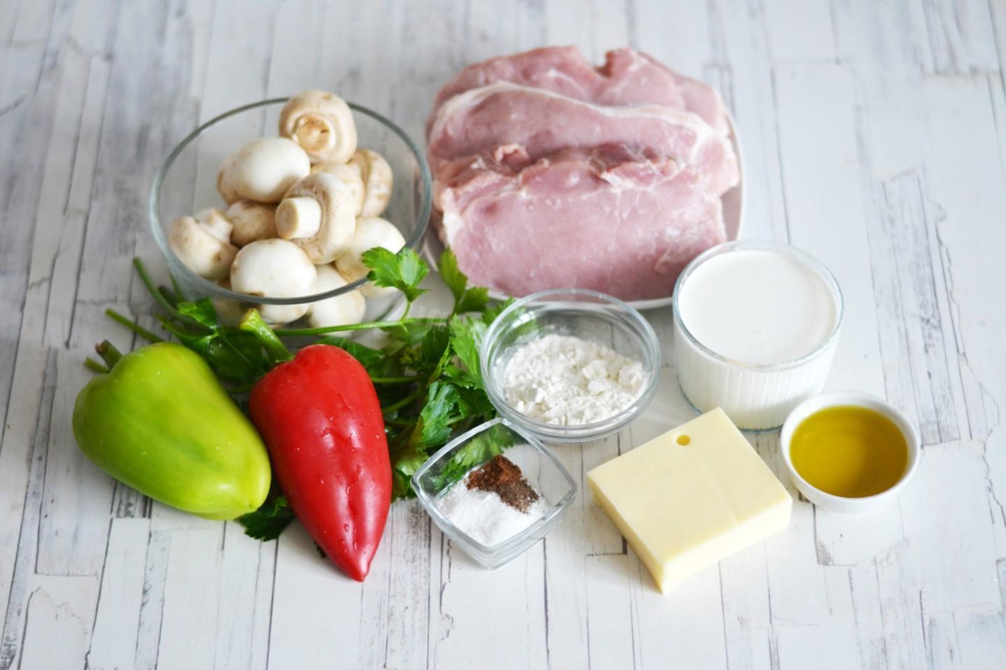The most delicious, juicy, tender meat for holidays and dinner! Pork with mushrooms and cheese, baked in the oven, is prepared from simple ingredients, resulting in a delicious dish with aromatic sauce of champignons and sweet peppers under a golden cheese crust. Be sure to prepare!
