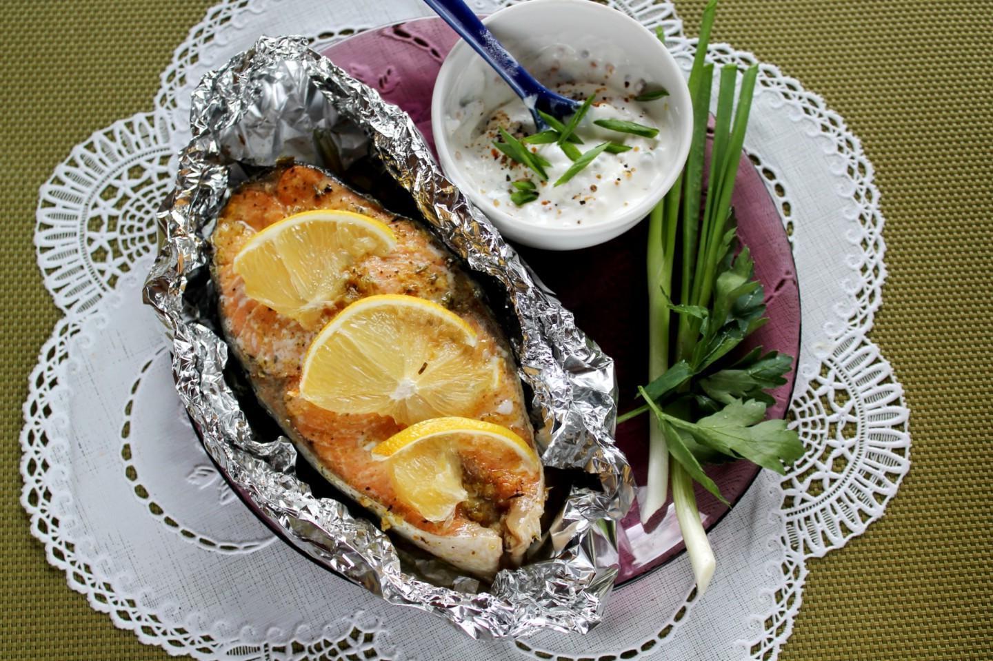 Useful, fast, simple, elegant, for a holiday dinner! Juicy trout steak in the oven in foil is a dish that can be served even to a child, if you do not use hot spices. It is better to serve them immediately after cooking, hot. With any suitable sauce, I suggest sour cream and mustard!