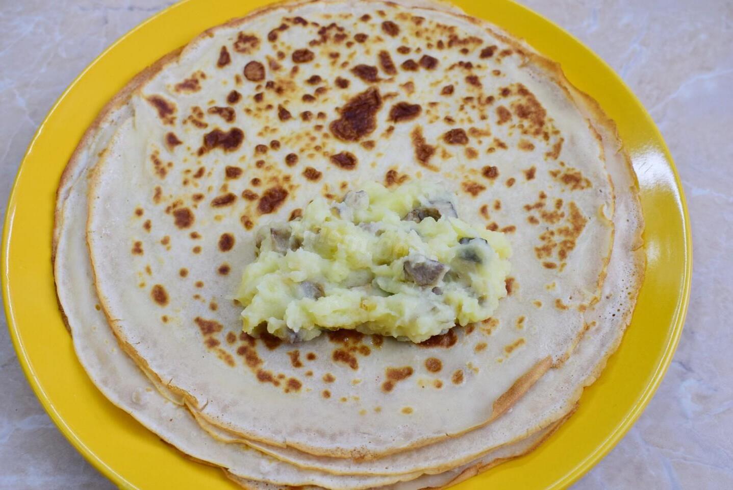 Tasty and satisfying, with a simple but very flavorful filling! Pancakes with potatoes and mushrooms are easy to make, especially if you have mashed potatoes left over from dinner. Add some fried mushrooms and onions to it, and youʼre done — easy, quick and very tasty!
