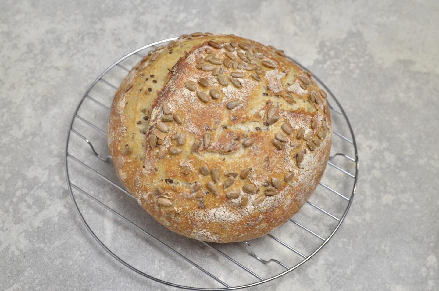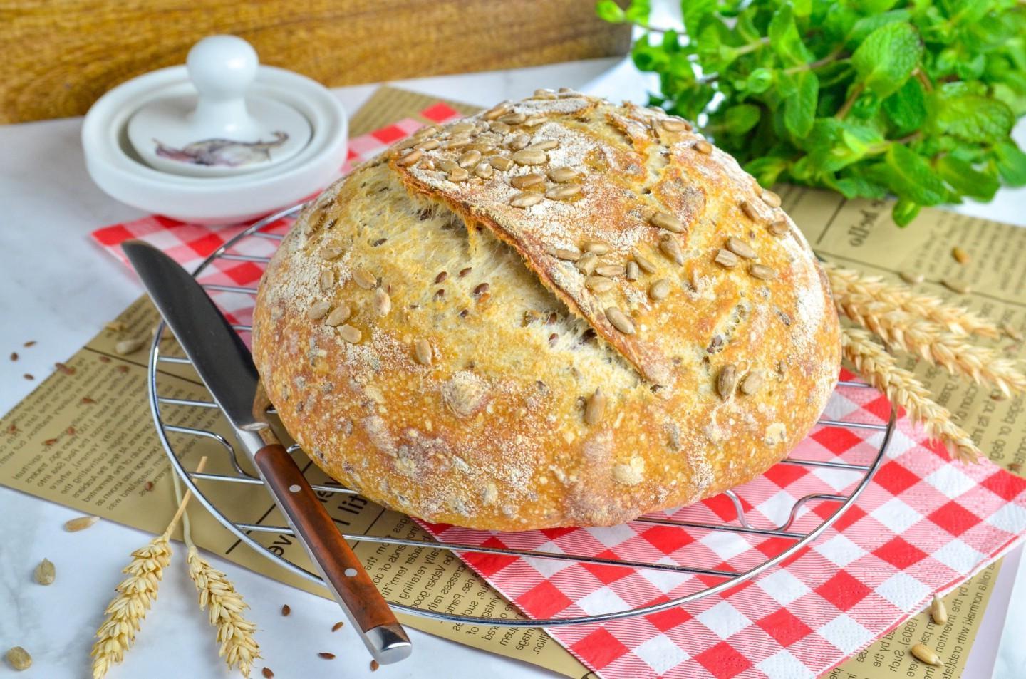 Delicious and so aromatic — it will make any meal more cozy! Wheat sourdough bread is interesting because assorted seeds are added to the dough. Flax makes it mega-healthy, the rest of the seeds add crispness and taste. Preparing bread is not difficult, especially if you knead it in a mixer.