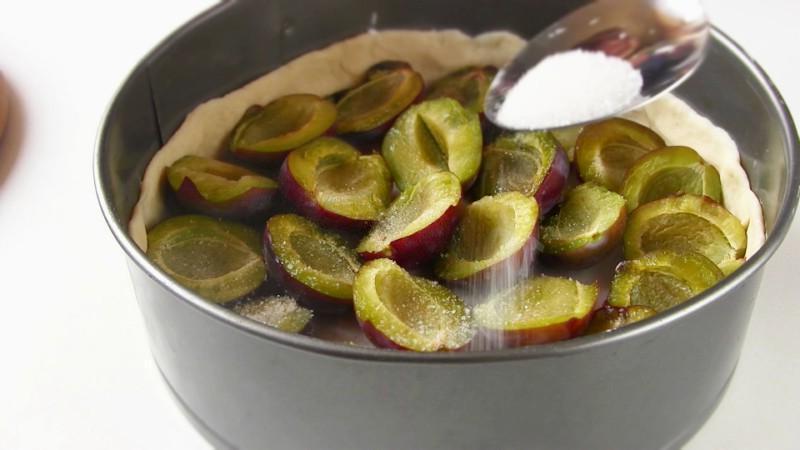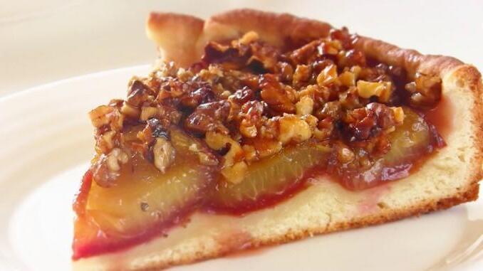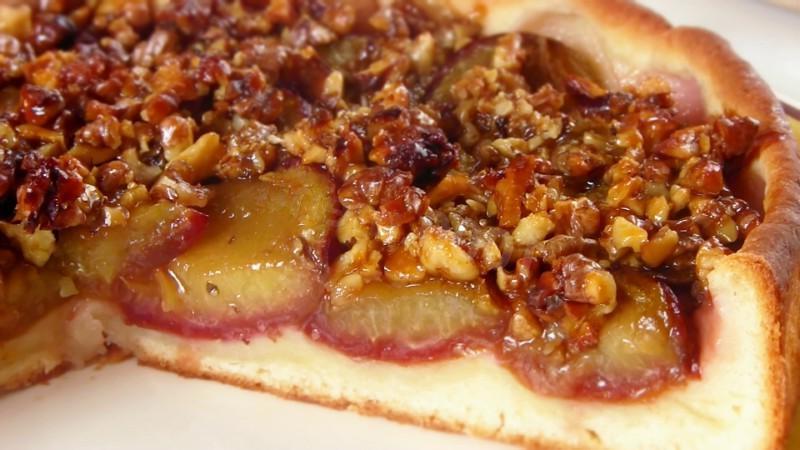Very juicy soft dough and crispy nut crust! Delicious open-faced fruit pie — filled with fresh plums and walnuts on curd dough.