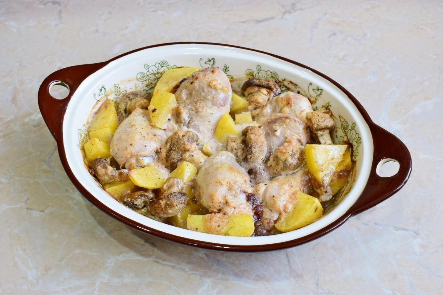 An ideal dish for everyday life and holidays! Potatoes with champignons and chicken have such a pleasant combination of ingredients that many will like it. It is prepared without much hassle and can be served on any table.