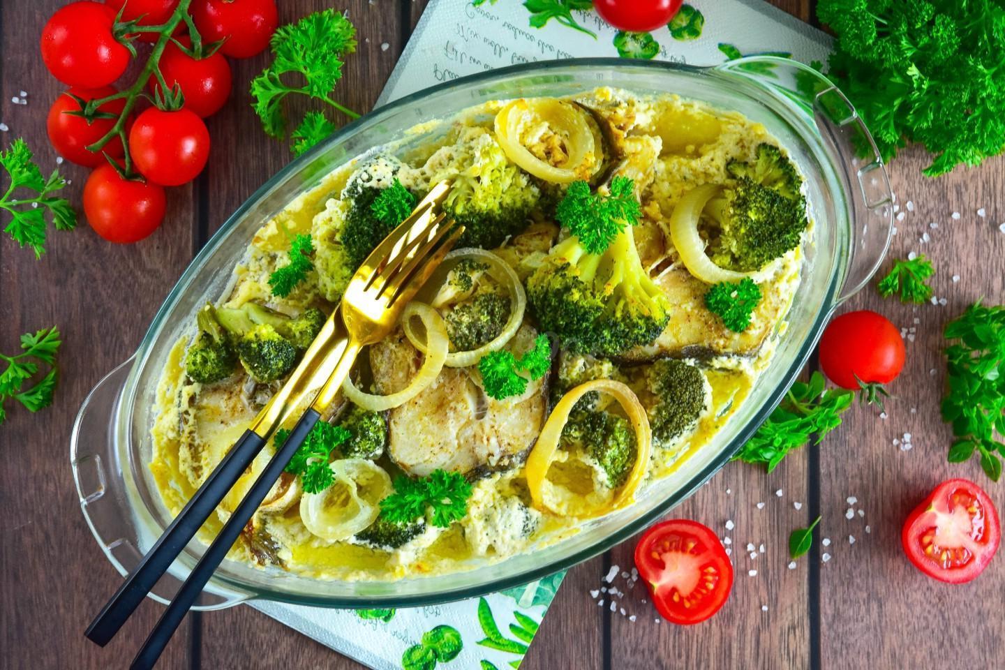 An unforgettable treat for everyday life and holidays. Cod steak is cooked in the oven at the same time as a side dish of potatoes and broccoli, which saves a lot of time. Delicate creamy mayonnaise sauce gives the fish additional juiciness and wonderful taste.