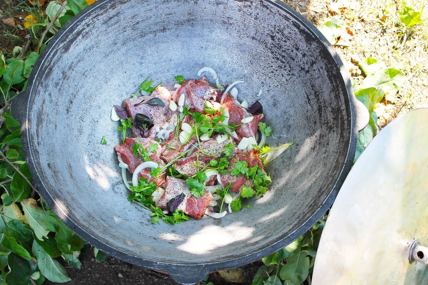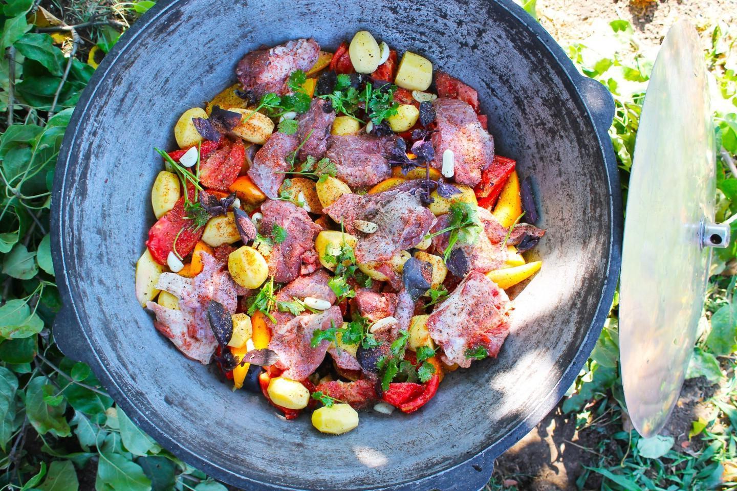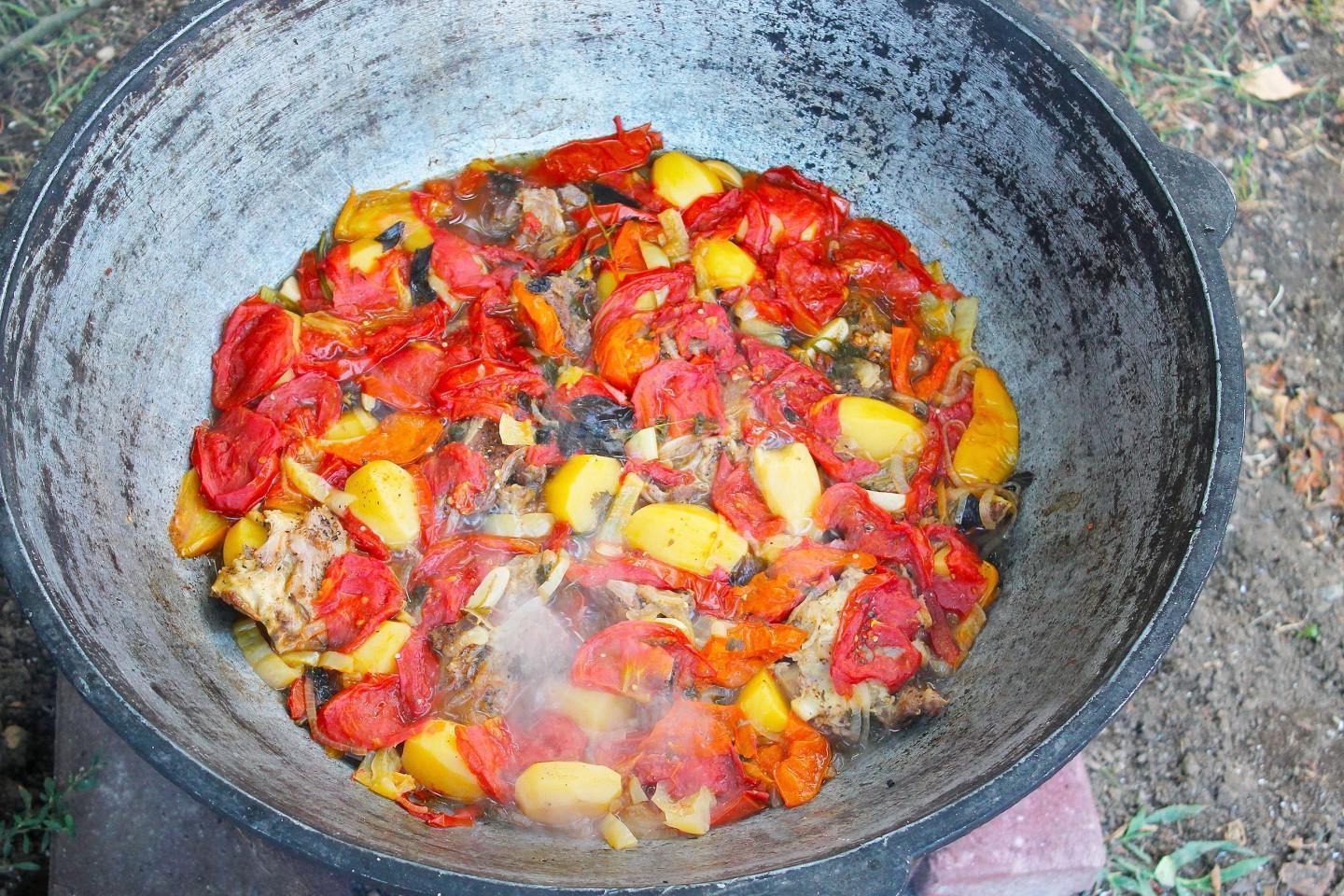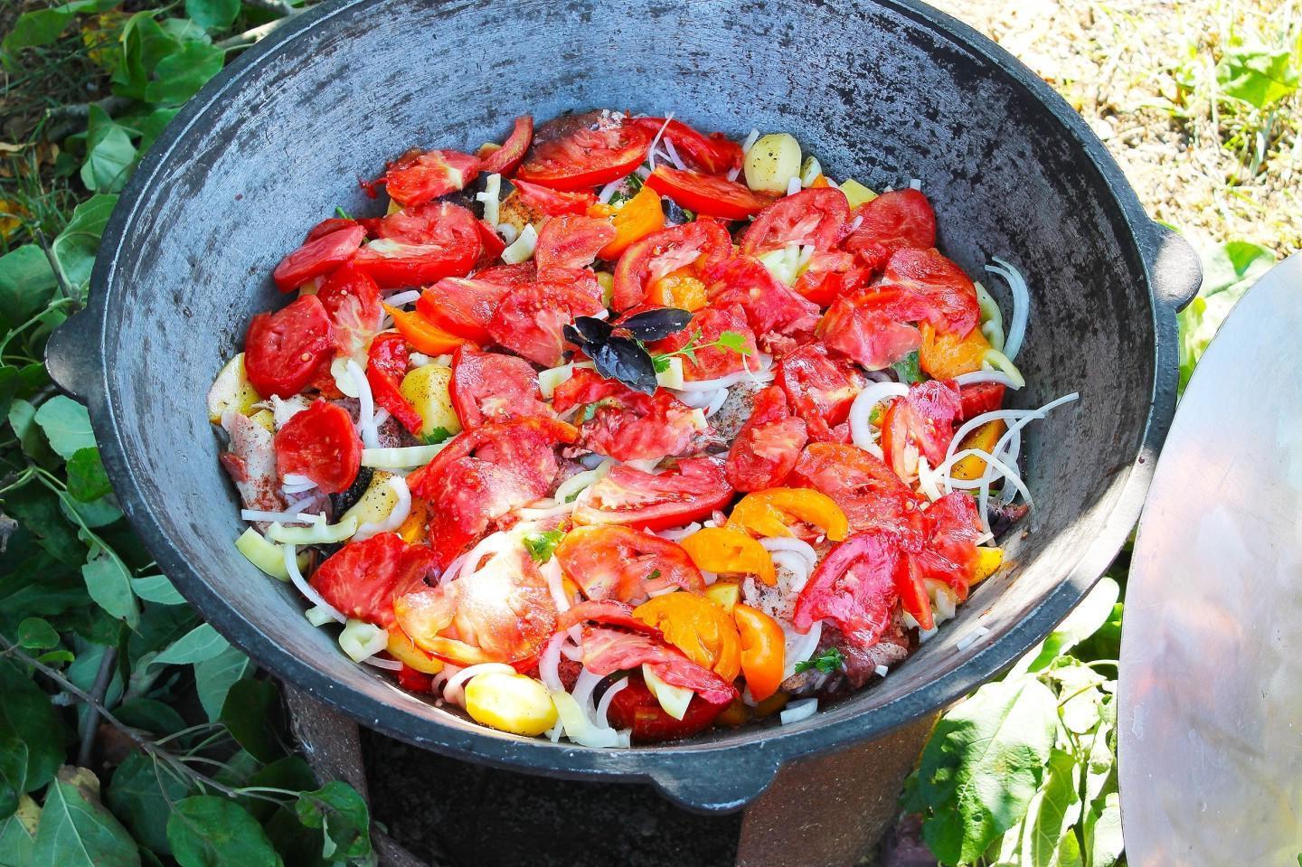 Nourishing, healthy and tasty! A riot of colors in a plate! Khashlama in a cauldron over a fire is an excellent dish of Caucasian cuisine for a large friendly company! Meat and vegetables stewed in beer and their own juice are simply the height of gustatory bliss! You can cook khashlama at home or over a fire.