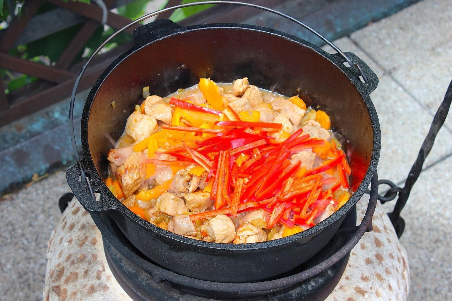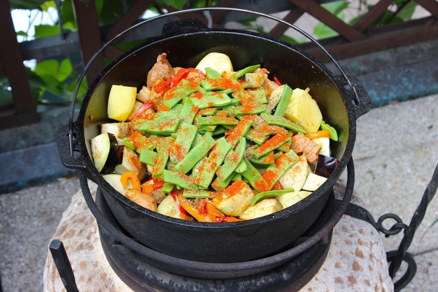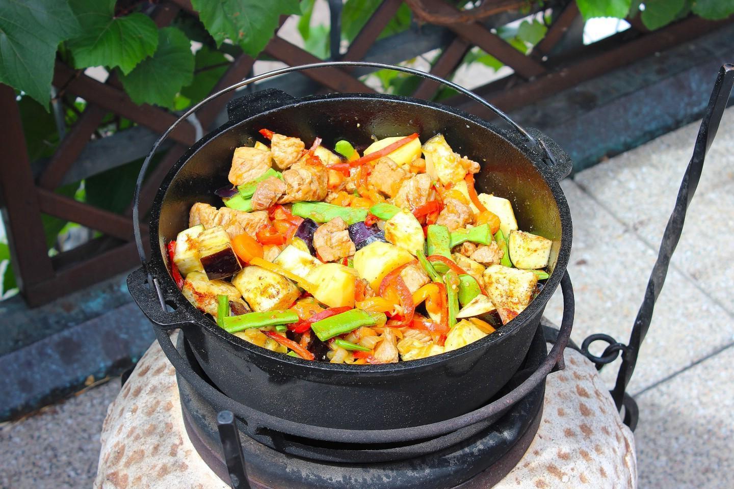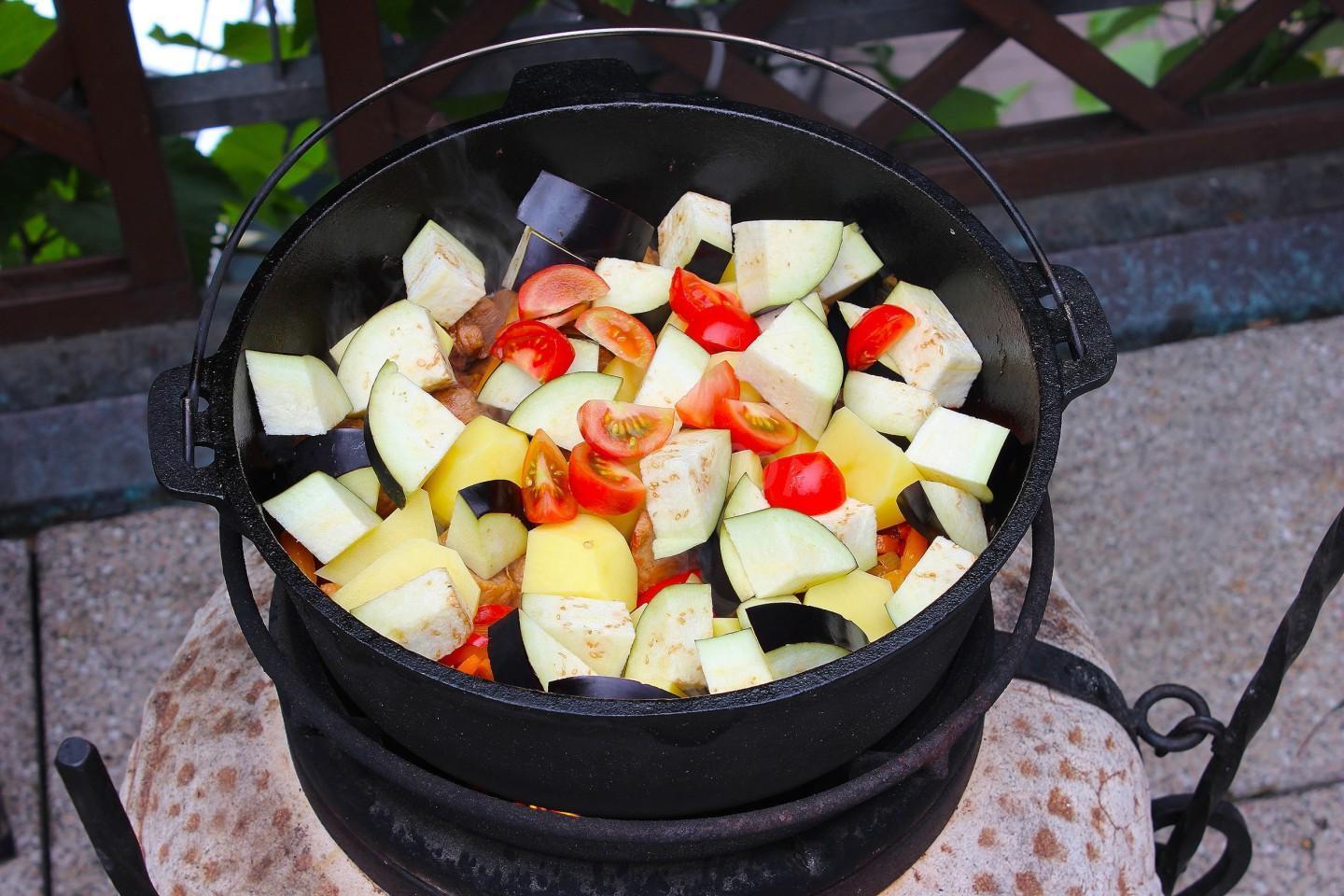 Rich, juicy, bright, with a summer mood! Vegetable stew in a cauldron with meat and potatoes over a fire will satisfy even the largest company. You can use any meat and vegetables for it, of your choice. And therefore the taste of the dish will be new every time!