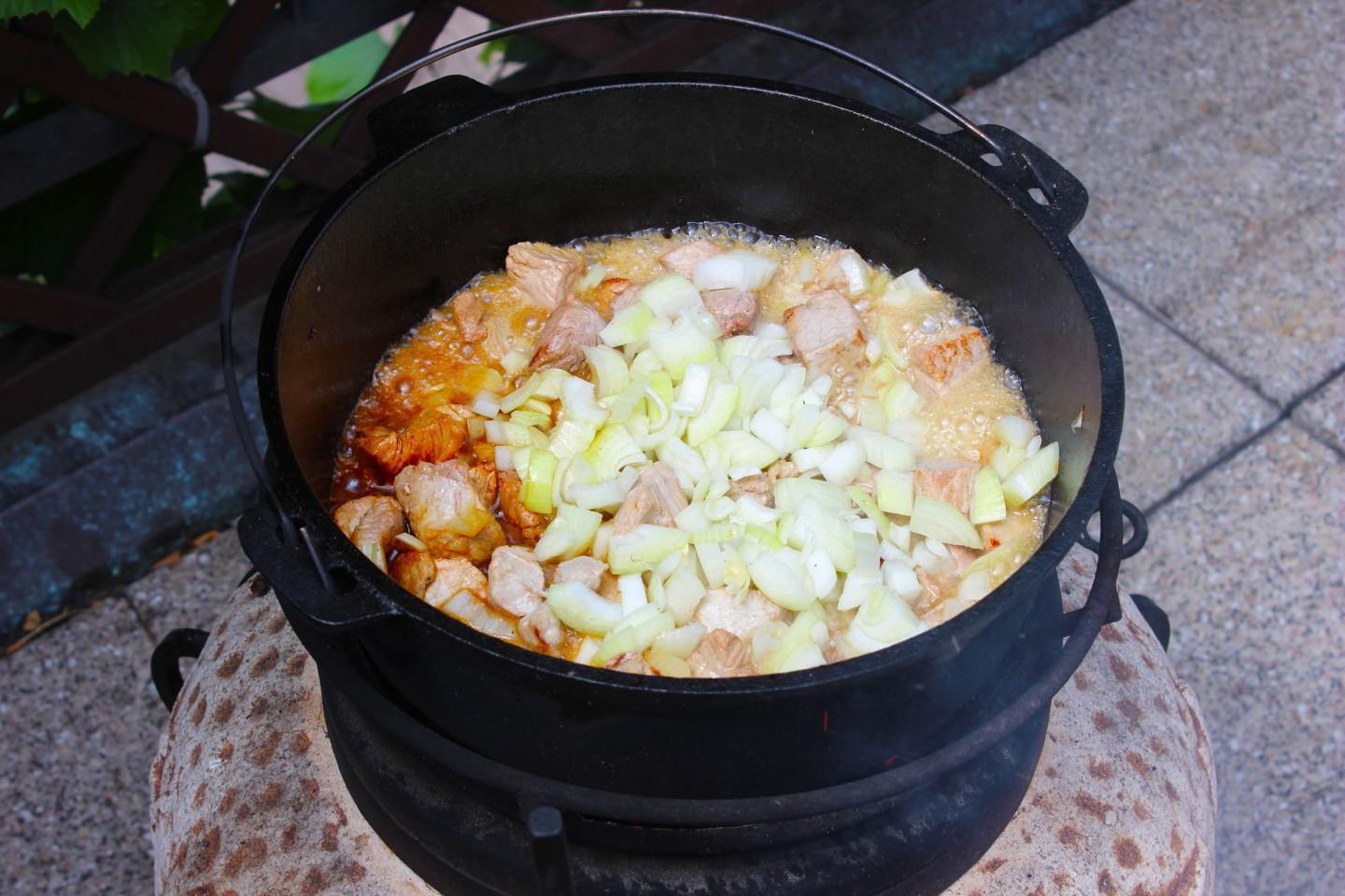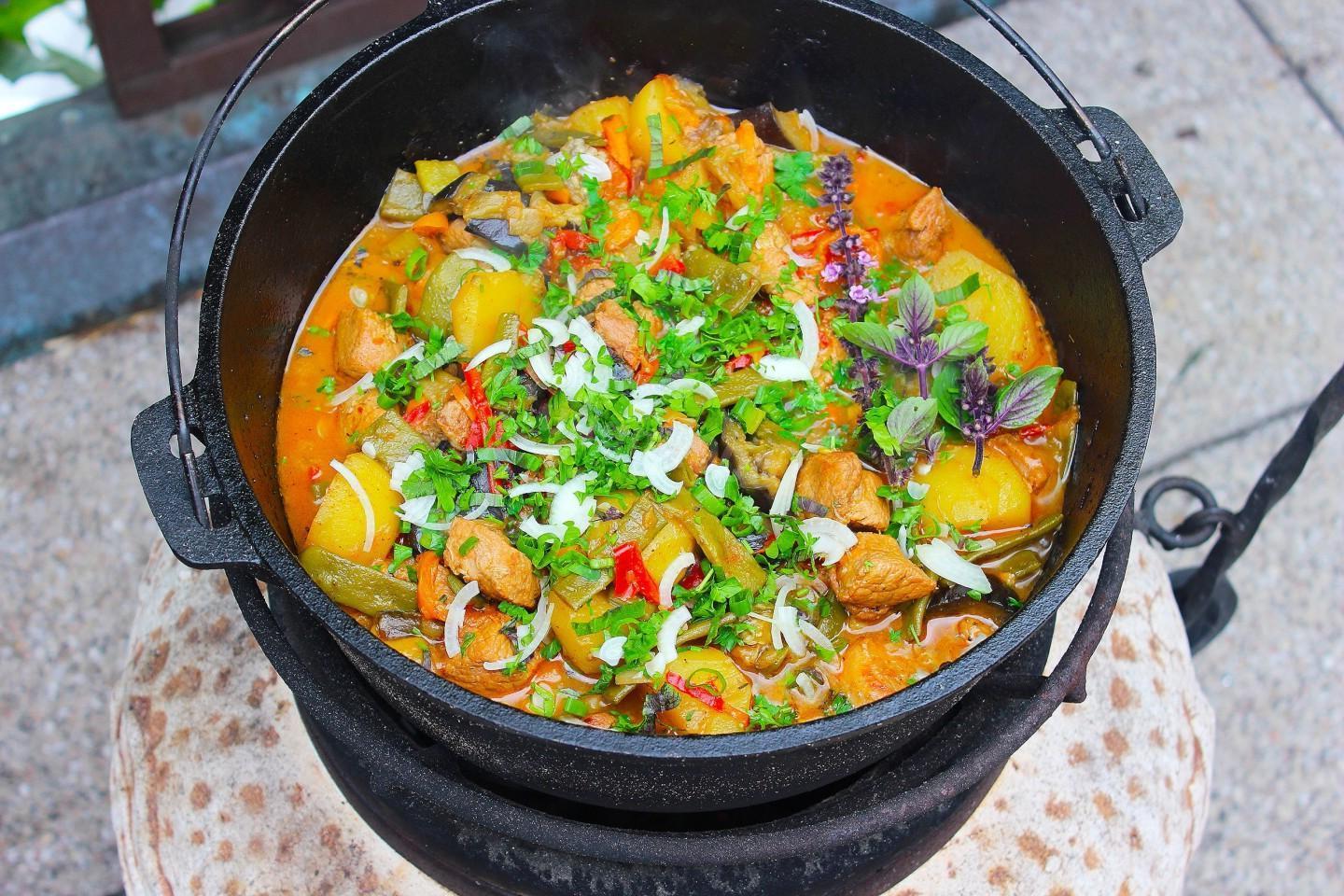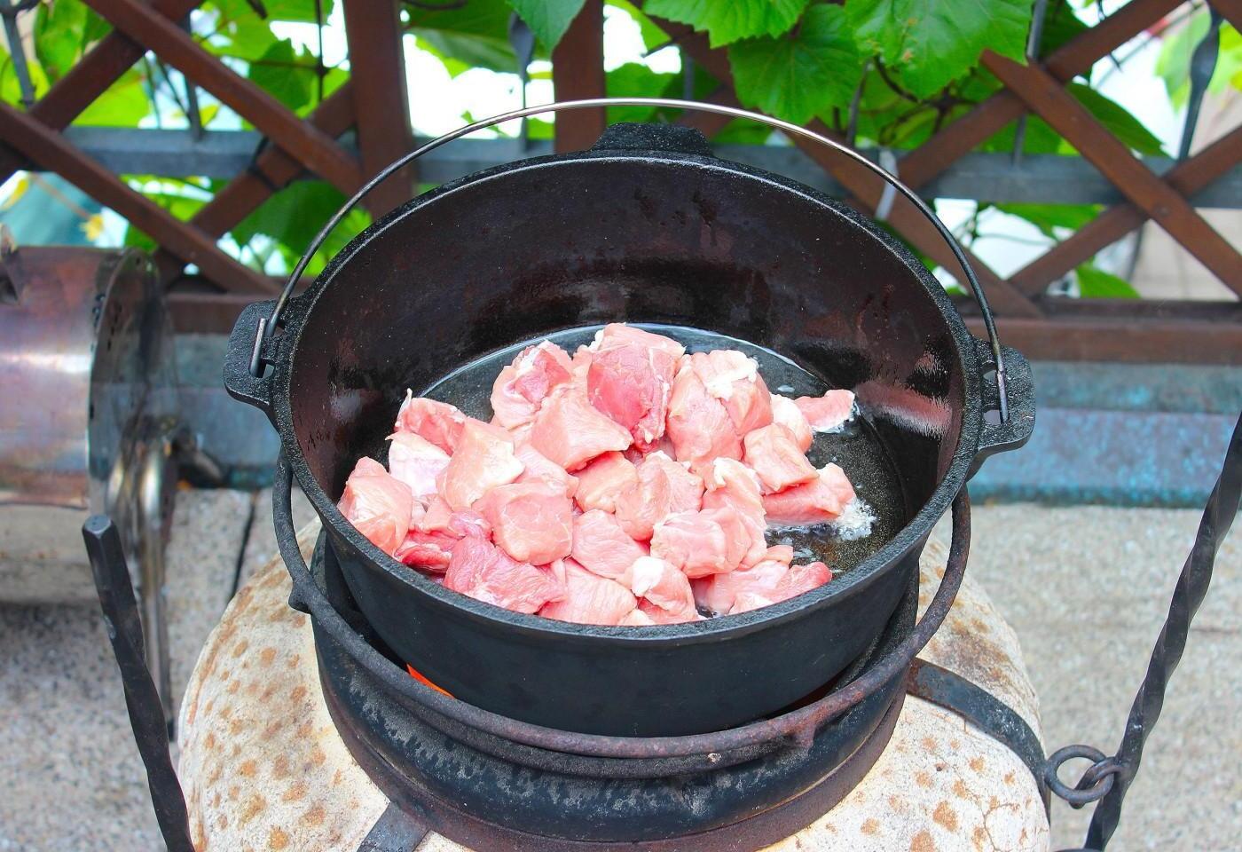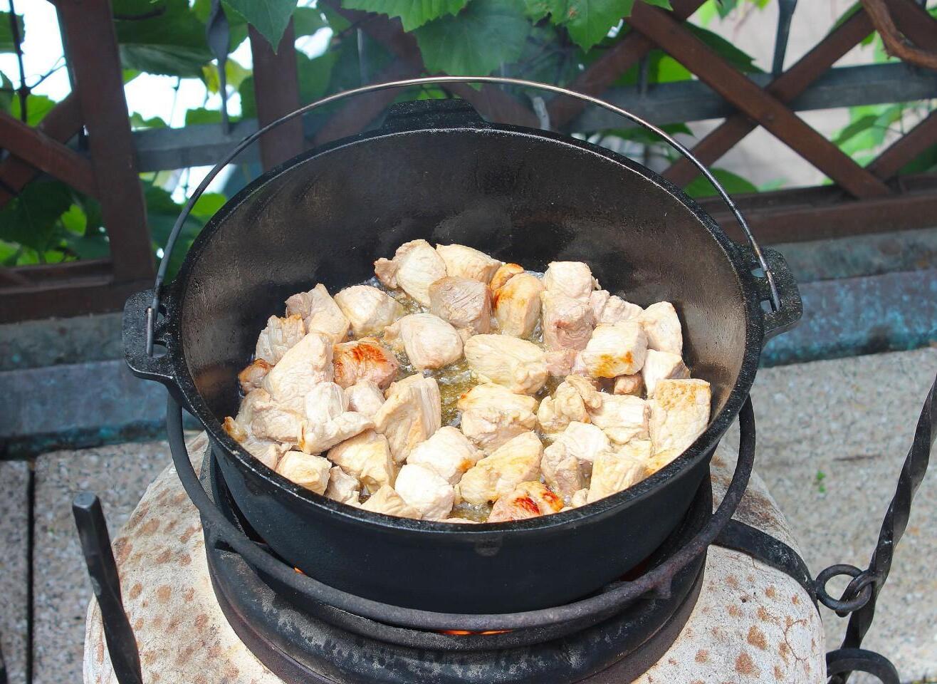Rich, juicy, bright, with a summer mood! Vegetable stew in a cauldron with meat and potatoes over a fire will satisfy even the largest company. You can use any meat and vegetables for it, of your choice. And therefore the taste of the dish will be new every time!