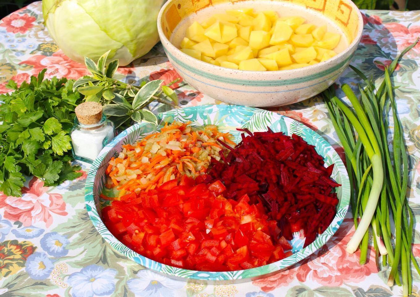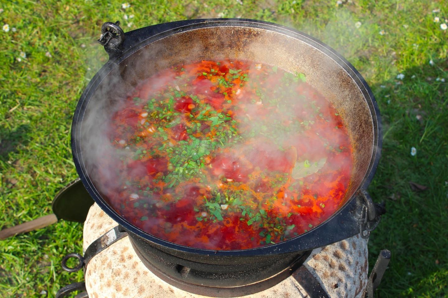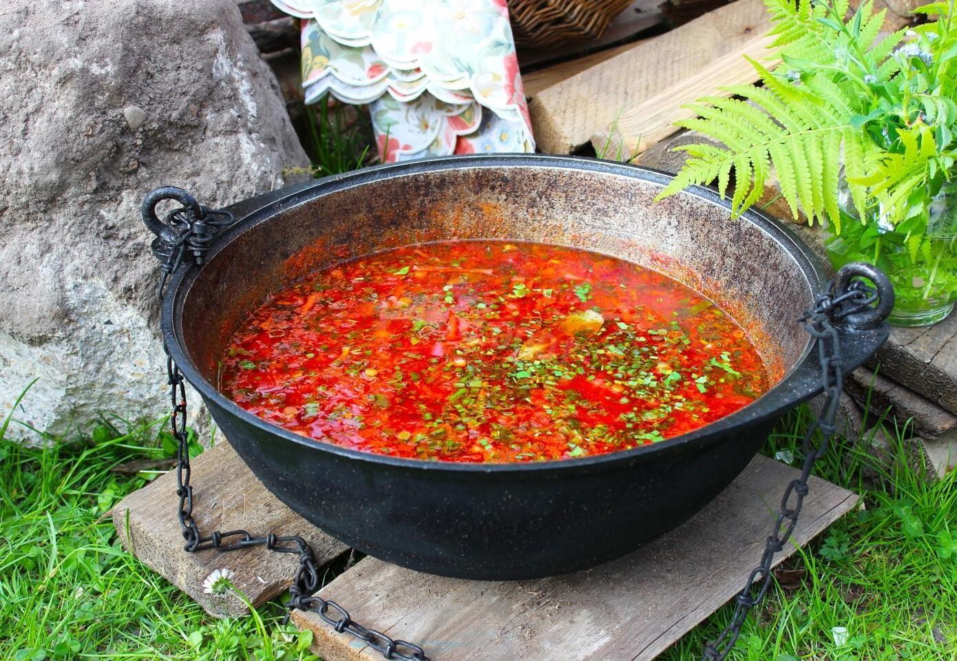 The most delicious and bright, rich, appetizing! You can cook borscht in a cauldron over a fire at the dacha or at a picnic with friends and family. The broth can be prepared from any meat: beef, pork, poultry, or you can make a dietary version using vegetable broth or water.