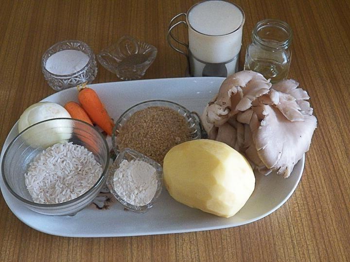 Aromatic, rich mushroom soup with bulgur! Today I will prepare mushroom soup from oyster mushrooms, a small amount of mushrooms that were left in the refrigerator after yesterdayʼs achar (spelt) pilaf. In general, in my life I adhere to the principle from the famous cartoon: “Use everything that is at hand and don’t look for anything else.” And I have mushrooms on hand, that is, in the refrigerator, in particular oyster mushrooms, small onions, carrots, a glass of milk, a couple of potatoes, and some greens. And for the soup I also need a little rice, couscous (blgur), but you can do without it, then you need to take more rice, a spoonful of flour, salt, pepper, vegetable oil.